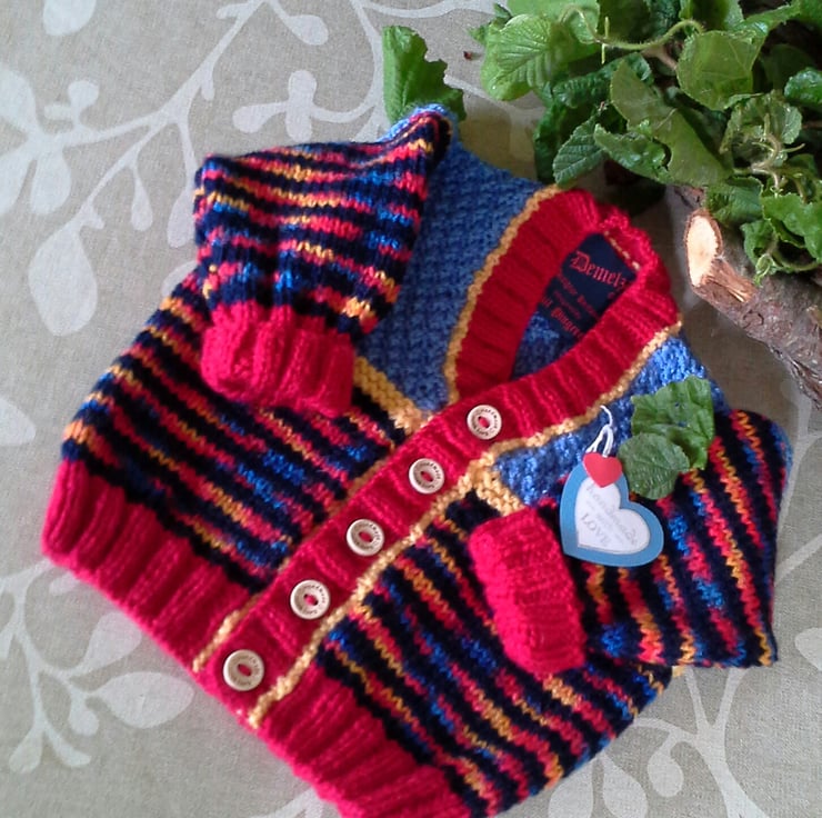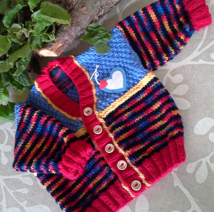 This eye catching cardigan has been designed and hand knitted in Cornwall using quality branded premium acrylic machine washable yarns manufactured in the UK and France. The buttons are made from genuine wood with the words 'hand made with love' burnt etched on to them. This stripey cardigan will make a perfect unique newborn baby or baby shower gift event. Unique quality baby products are in much demand by modern parent's and very much appreciated as they love to see their children dressed in designer clothing as apposed to mass produced clothing. The item has the branded 'Demelza' garment label attached to the back neck edge with the care instructions woven within it for lasting reference on the reverse side.