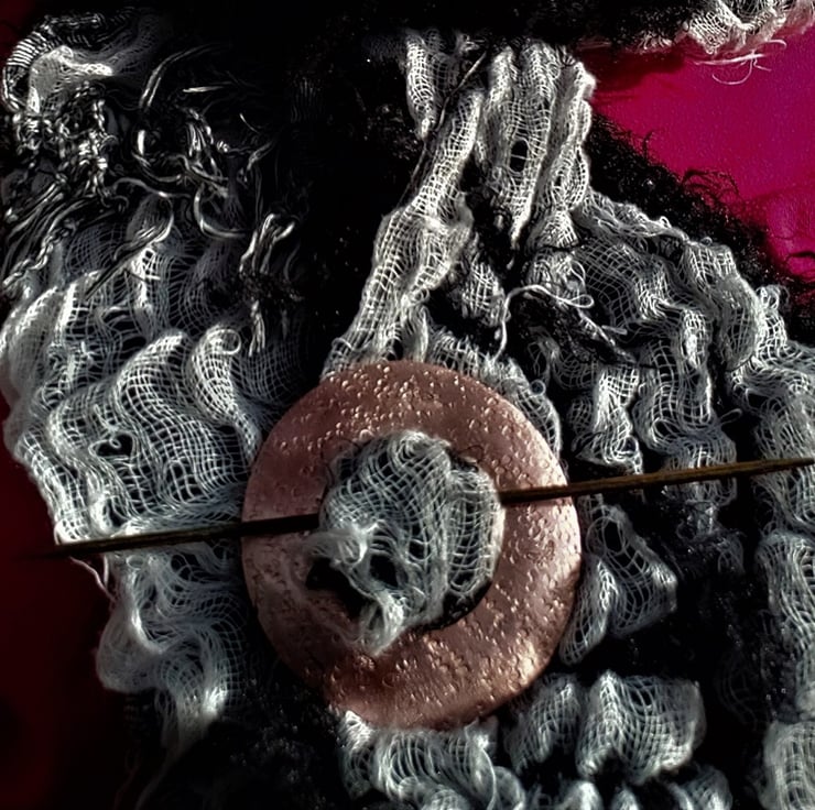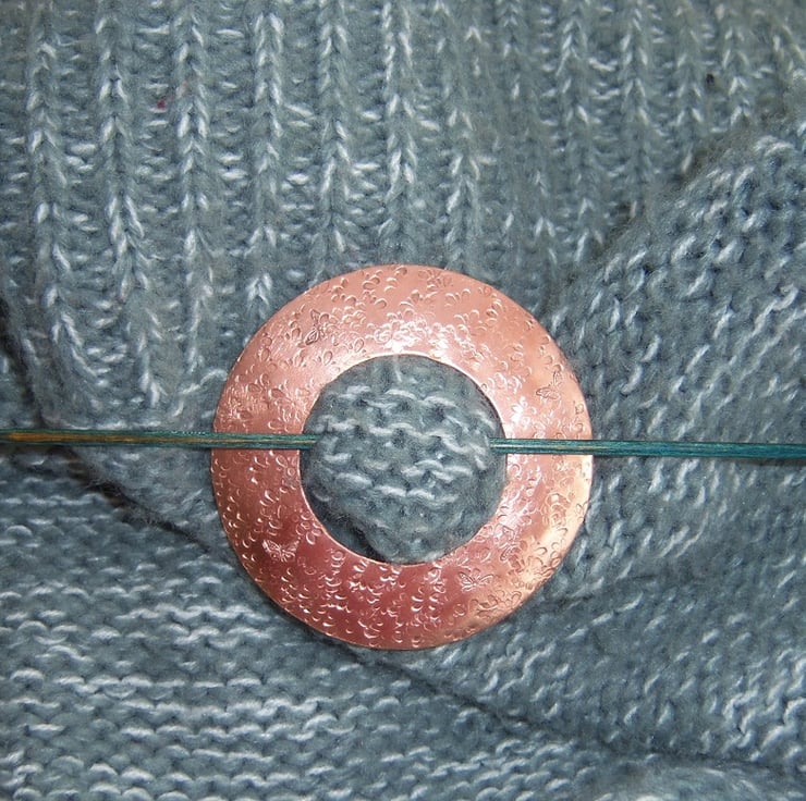 A circular copper shawl pin, imprinted with a textured random daisy effect design. There are also a few butterflies to be found amongst the flowers too. Slightly domed and 6.5cms across. The 15cms pin is multi-coloured wood.