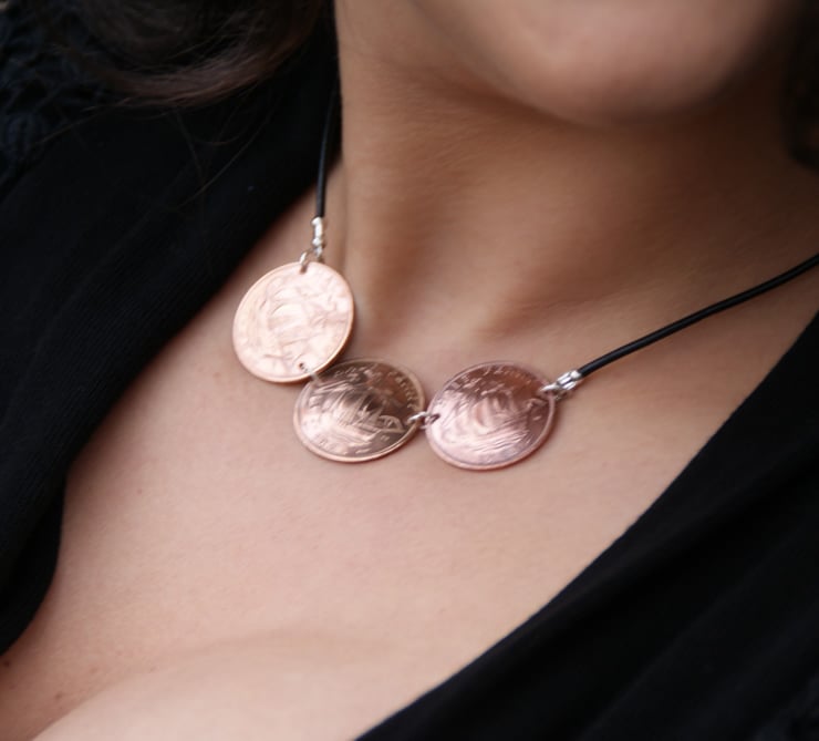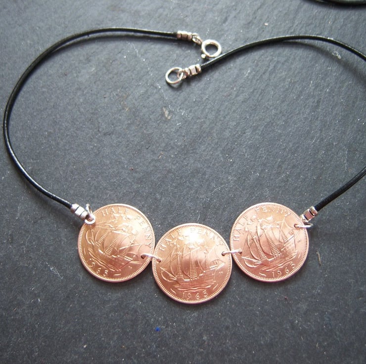 Halfpenny necklace. A necklace made with 3 bronze halfpennies from 1965. It can be with a date of your choosing if you want but that would take time to make and would NOT be next day despatch.)