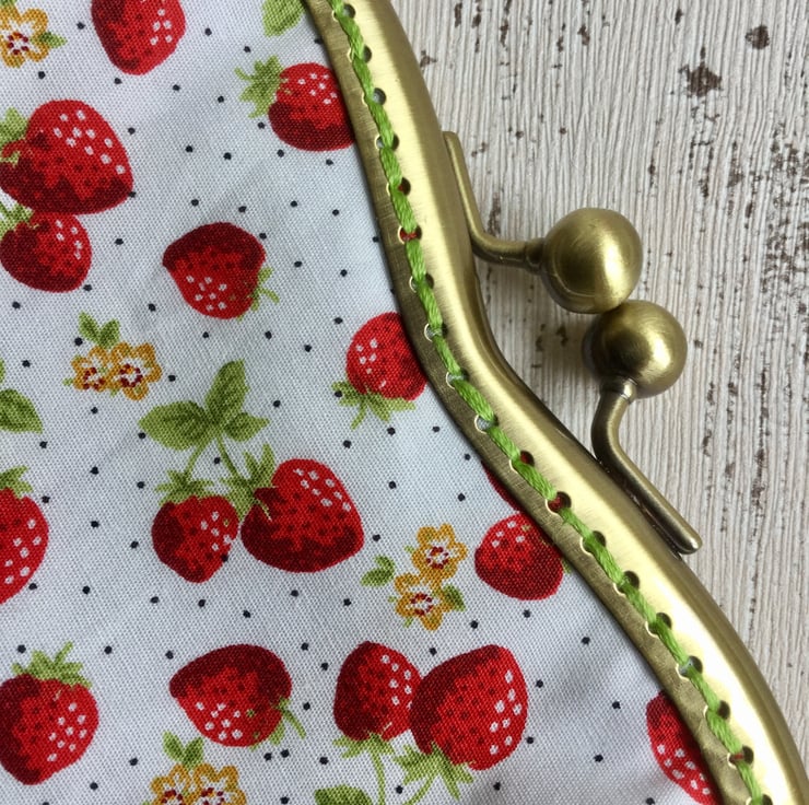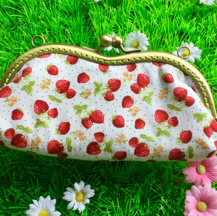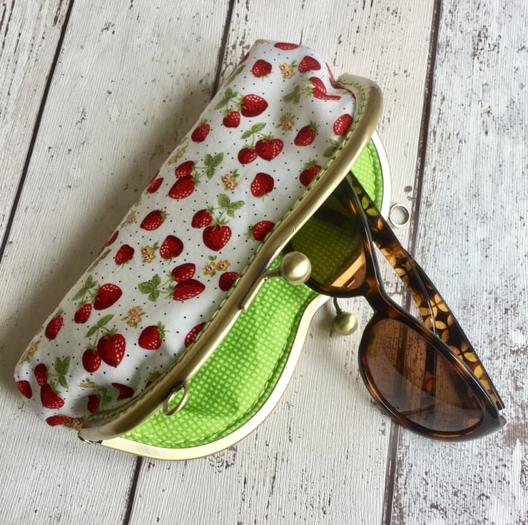 This fun glasses case with a delightful clasp closure is created from a strawberry designed cotton with a green cotton lining with a tiny square pattern. The clasp closure is attached with lime green embroidery silk. Additional fleece interfacing gives this case a soft feel, sits comfortably in the hand and will protect your glasses from knocks.