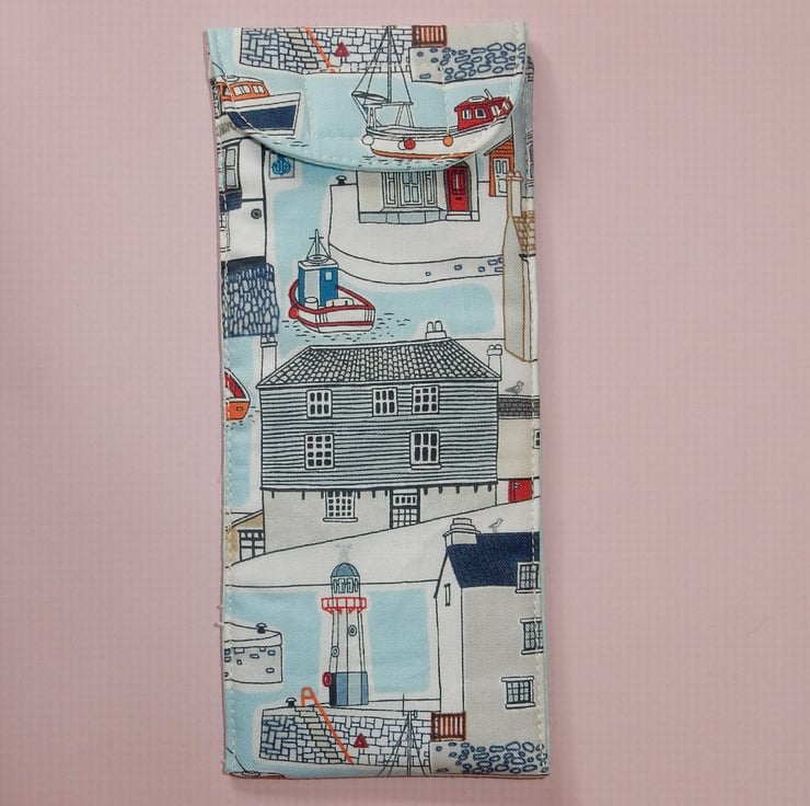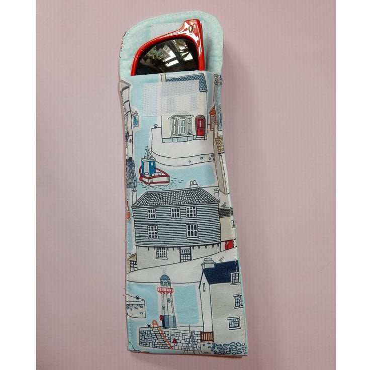 Are you getting ready for Summer holidays? This is a handy case for your glasses or sunglasses, which is made from a harbour scene cotton fabric, with a toning lining. It also has a layer of wadding for protection. The case fastens with Velcro.
