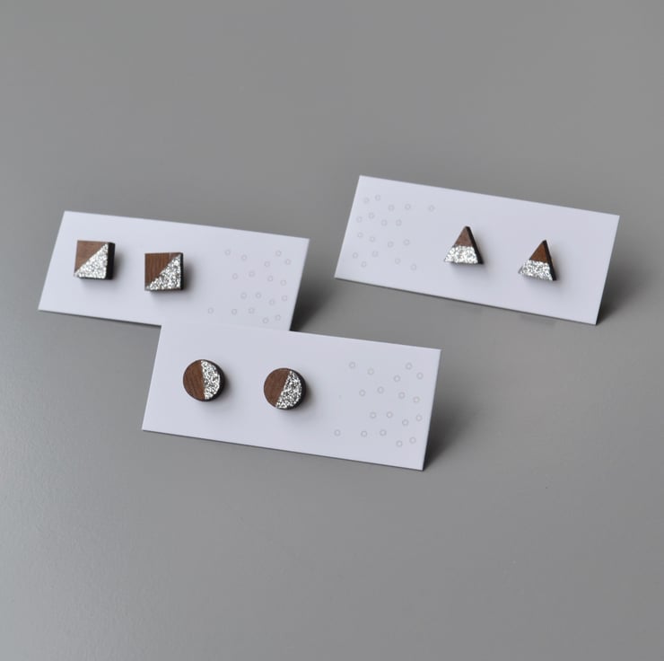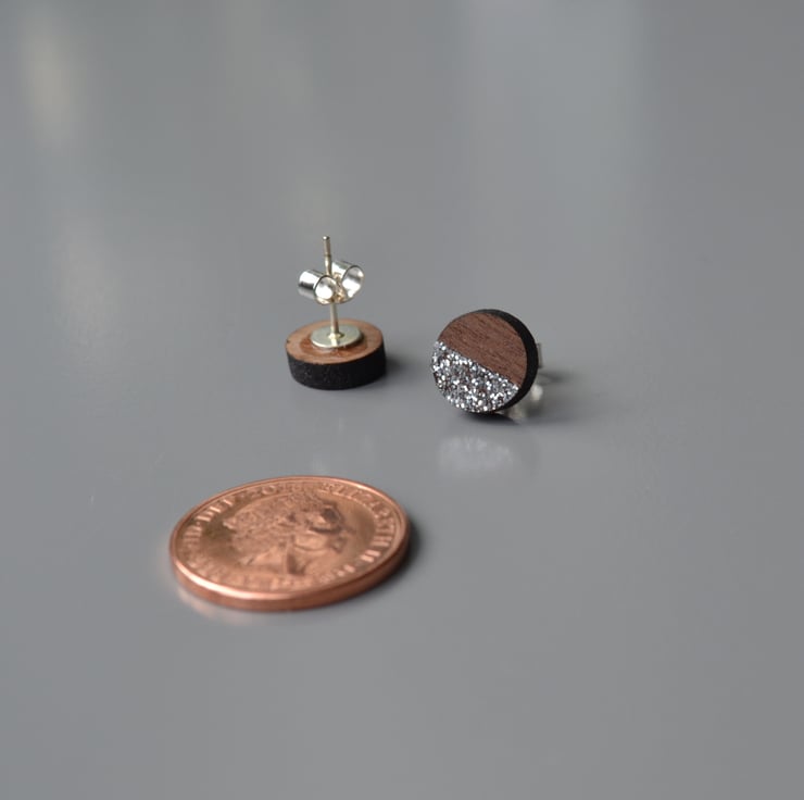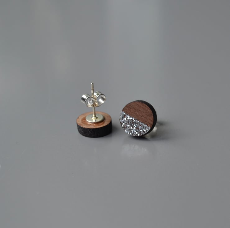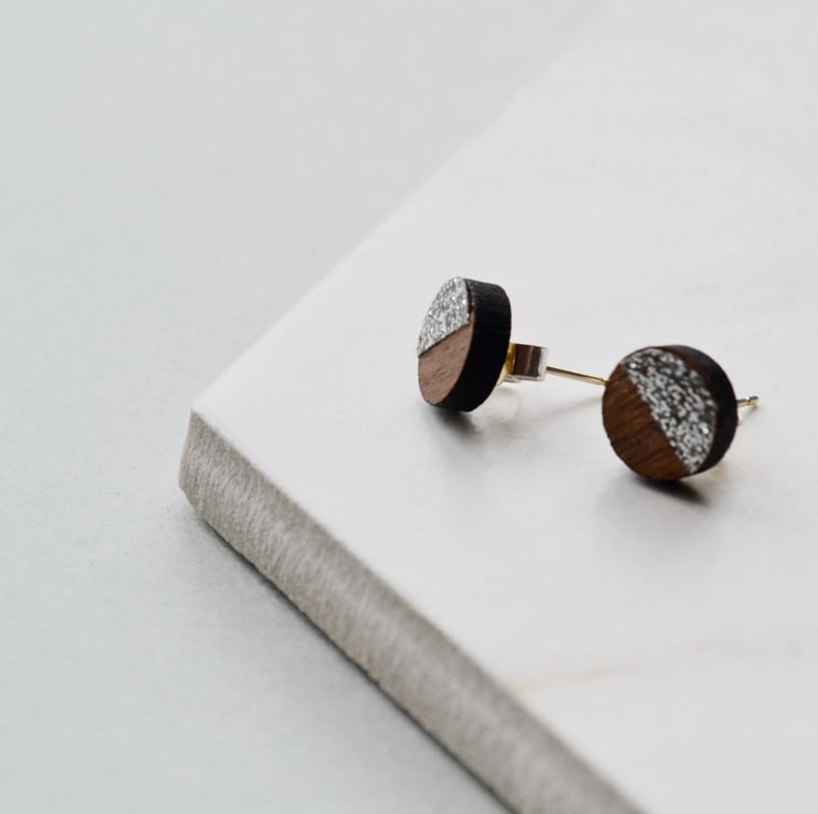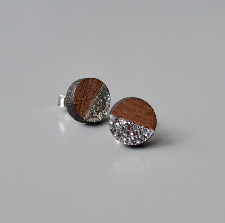 These handmade circle earrings are made from laser cut walnut wood, hand-decorated with silver glittery vinyl and sealed with varnish. The silver glitter is smooth and won't shed. It's also beautifully sparkly!