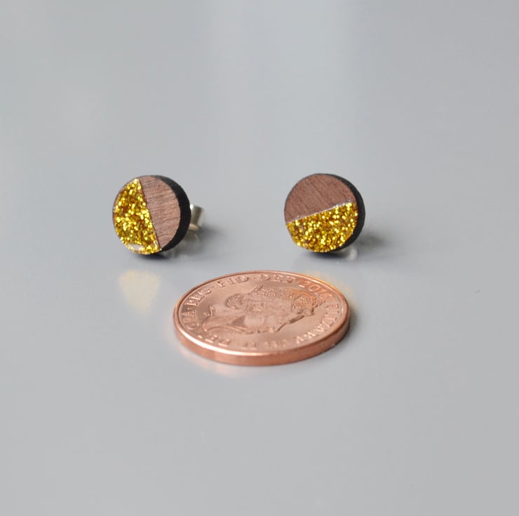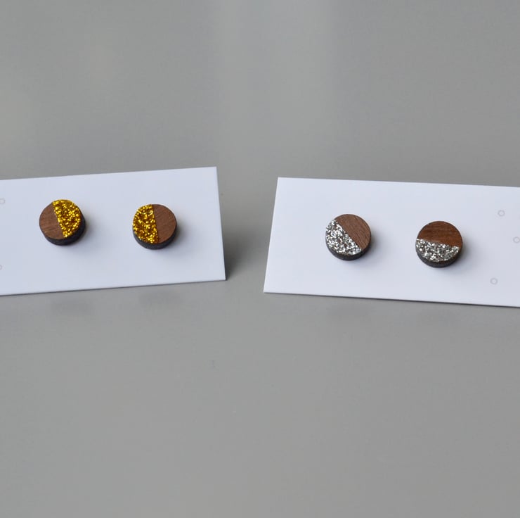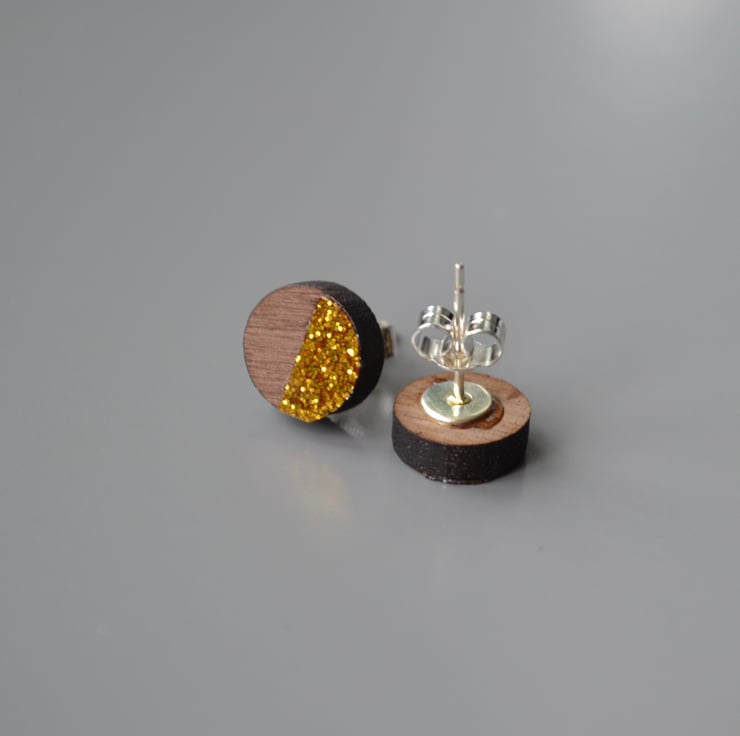 These handmade circle earrings are made from laser cut walnut wood, hand-decorated with gold glittery vinyl and sealed with varnish. The gold glitter is smooth and won't shed. It's also beautifully sparkly!