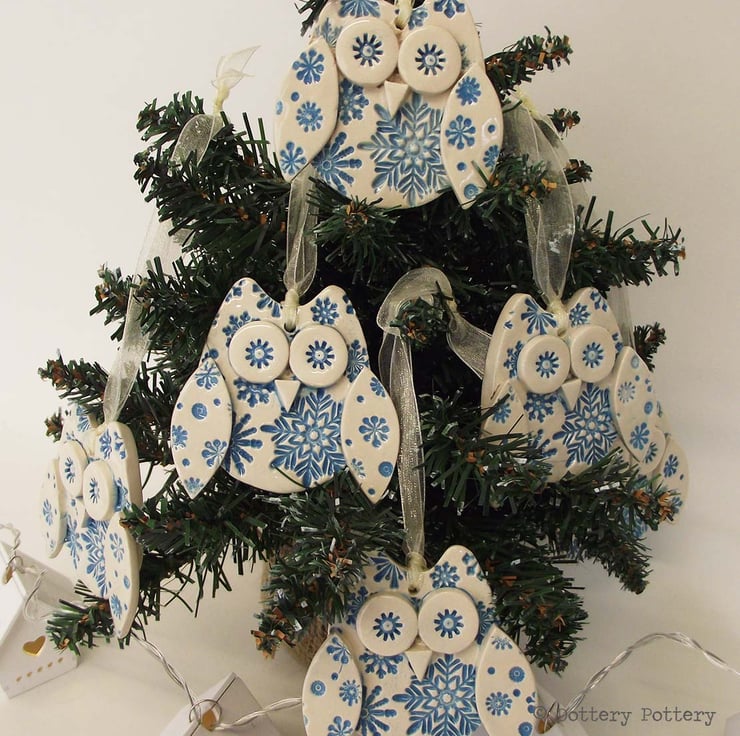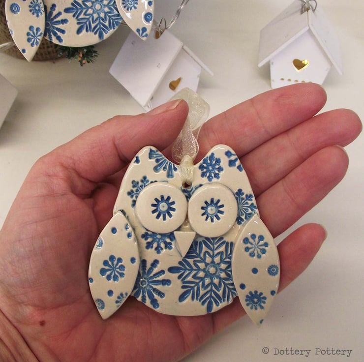This cute little owl is made from white earthenware clay. Each part has been embossed with pattern and then cut from hand made templates.