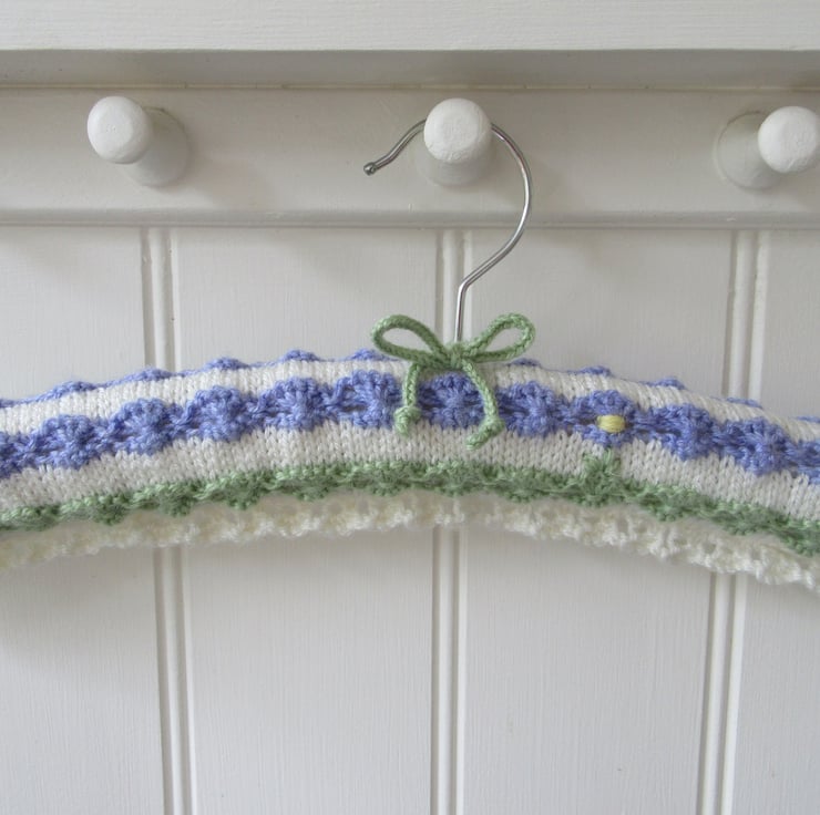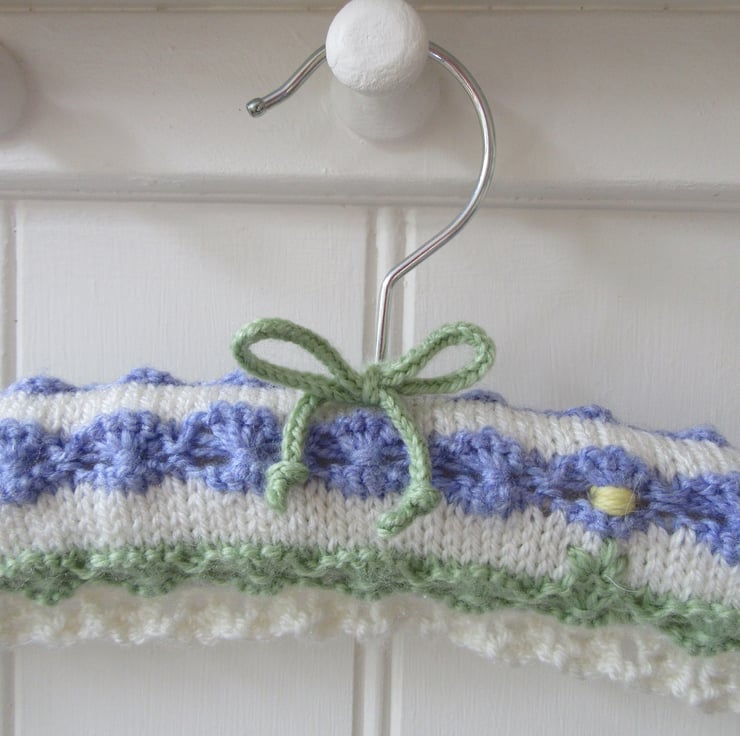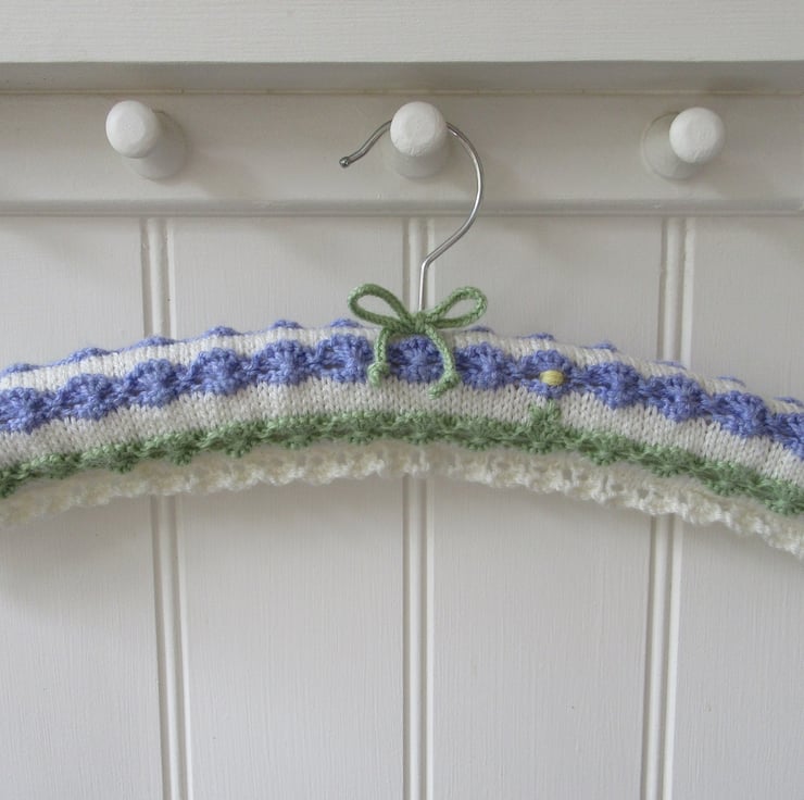 A hand knitted ladies coat hanger with ditsy summer flowers all in a row.