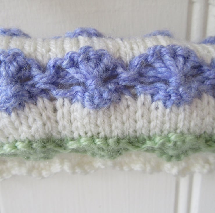 The front and back are knitted the same, with a row of green and a row of lilac flower stitch 'flowers'.