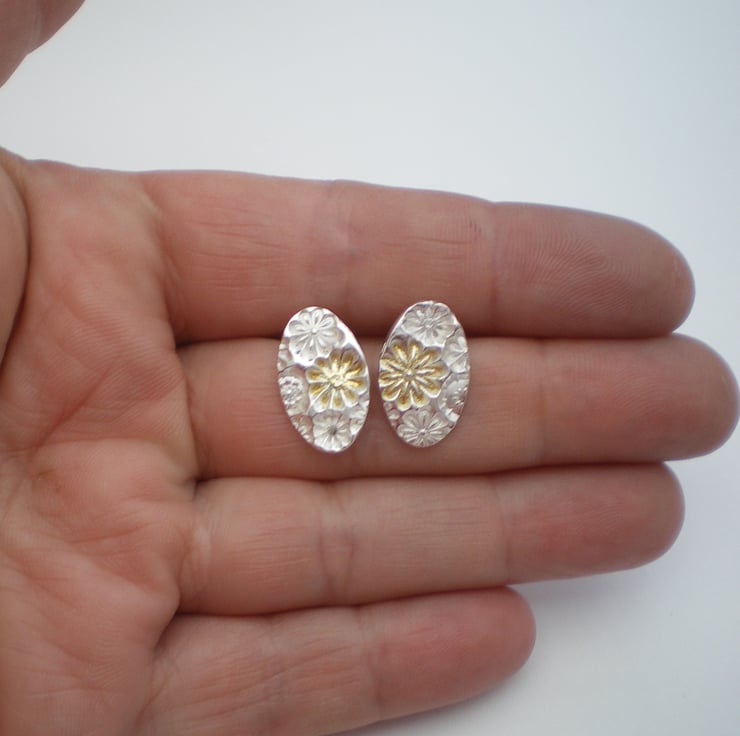 Little fine silver and gold floral textured oval post style earrings. Inspired by nature, made from reclaimed silver and gold they make a great eco friendly choice!