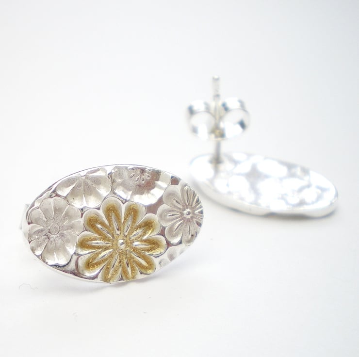 Little fine silver and gold floral textured oval post style earrings. Inspired by nature, made from reclaimed silver and gold they make a great eco friendly choice!