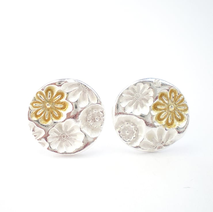 Little fine silver and gold floral textured round post style earrings. Inspired by nature, made from reclaimed silver and gold they make a great eco friendly choice!