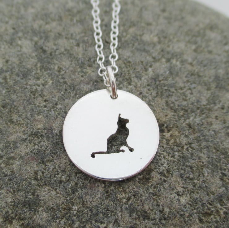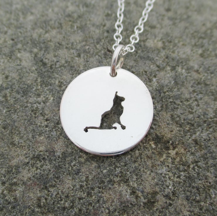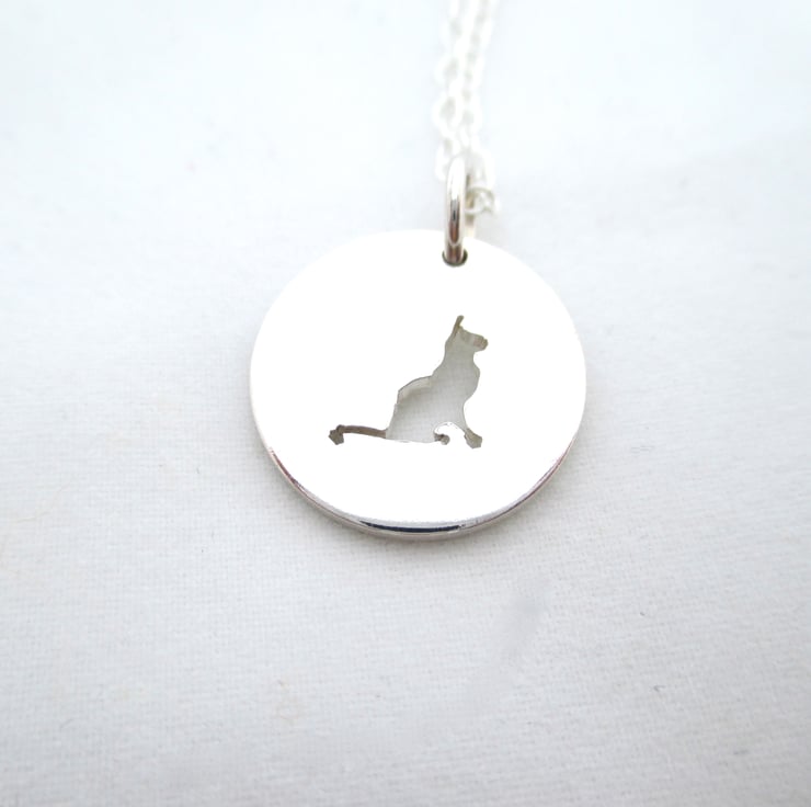 Made using a saw, a file, a hammer, pliers, a drill, silver solder and quite a bit of elbow grease . This dainty 18" necklace is light enough to wear as an everyday piece and is perfect for cat lovers.
