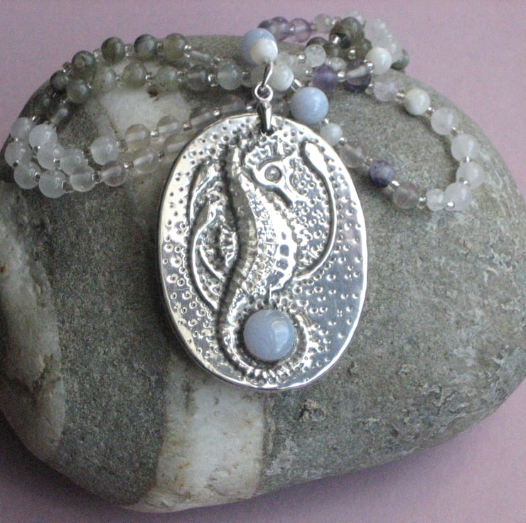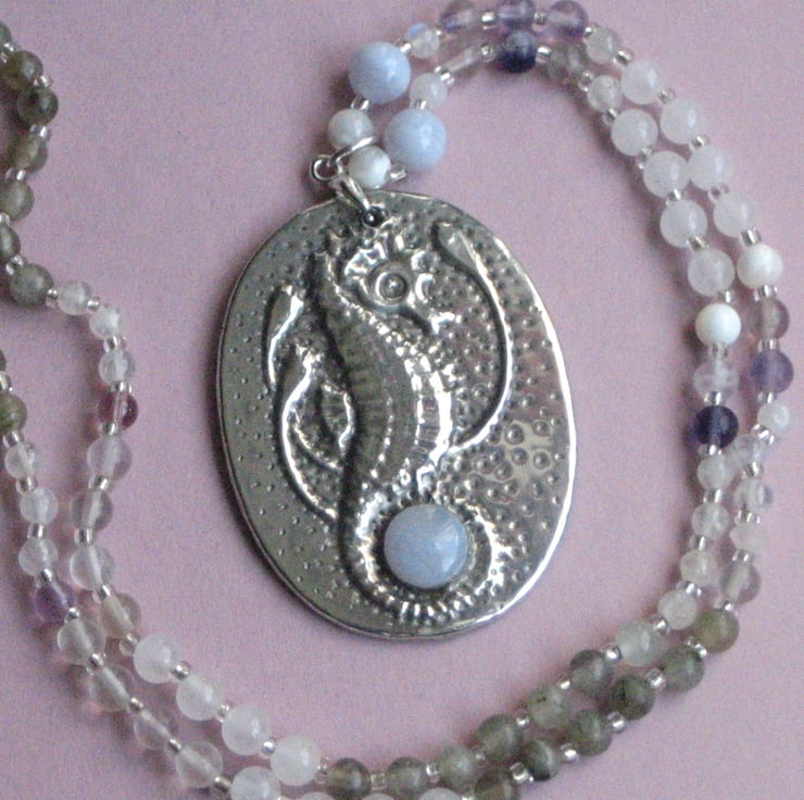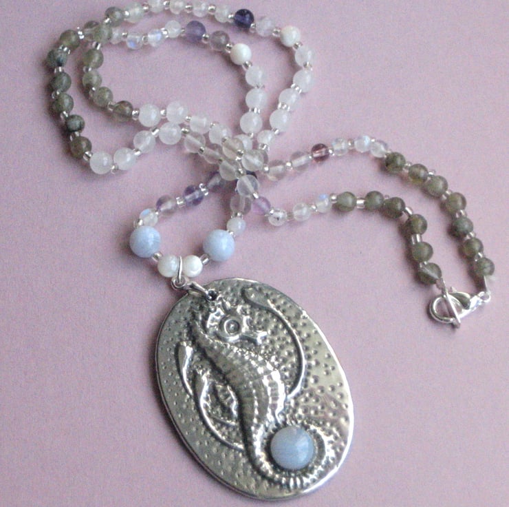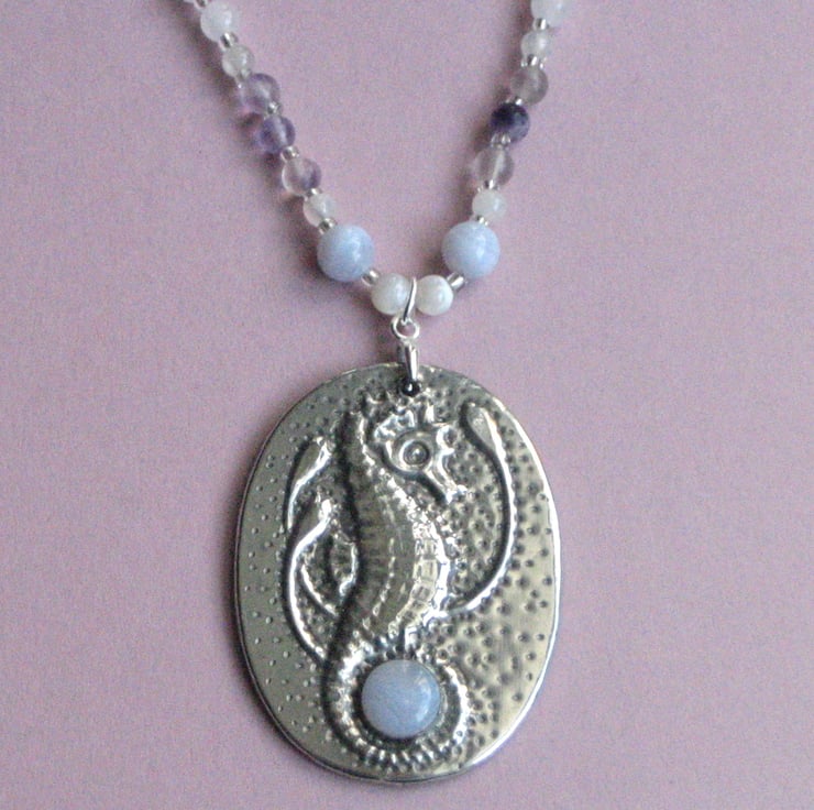 Seahorse pendant handmade in silver pewter with blue lace agate cabochon on a gemstone necklace.