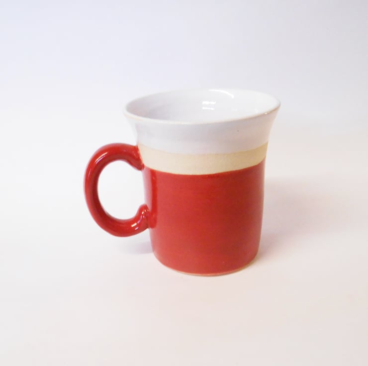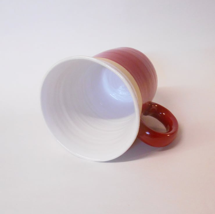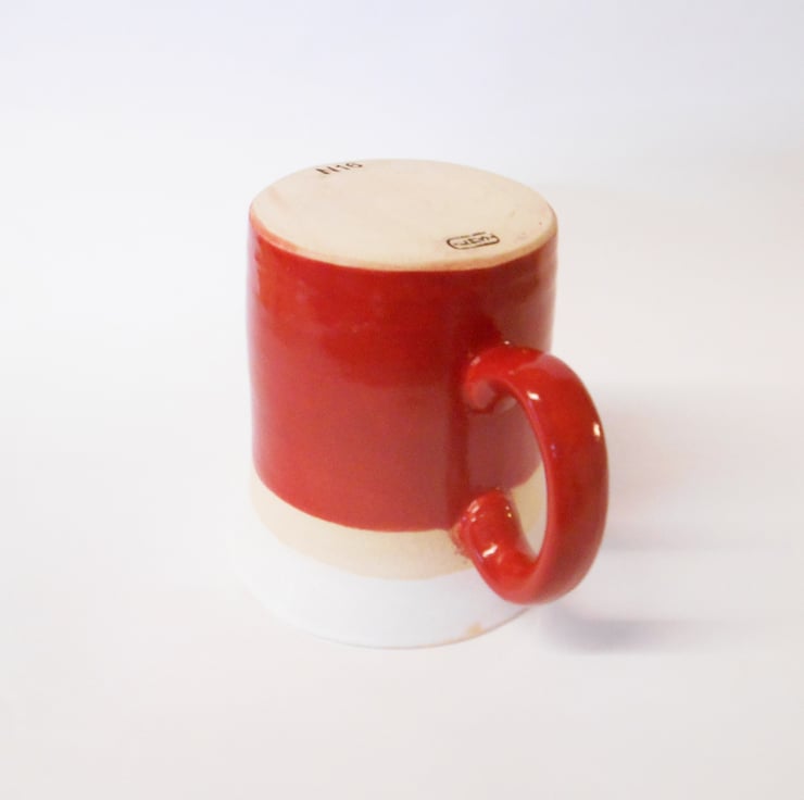It has been glazed with shiny tin white on the inside and top edge, and the bottom part of the mug has been glazed in Bright red shiny glaze.