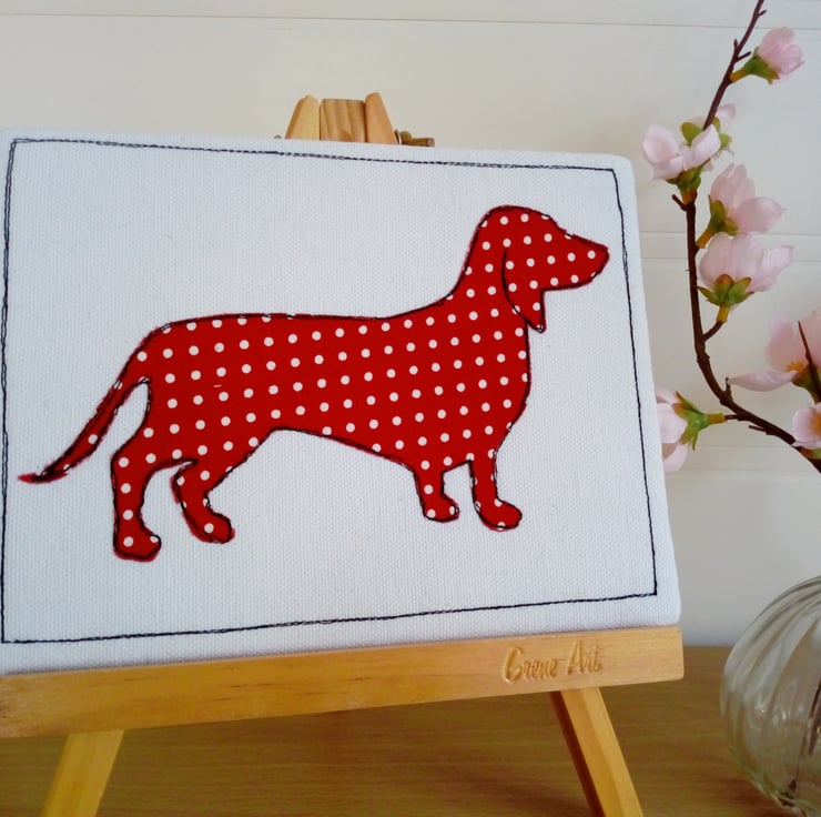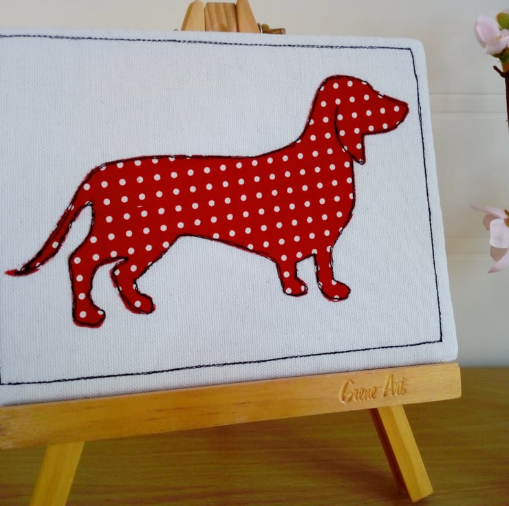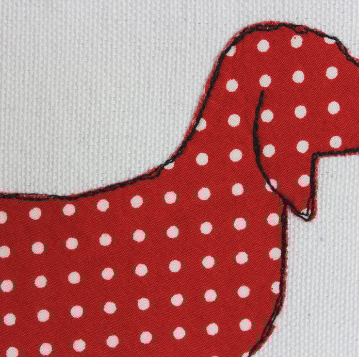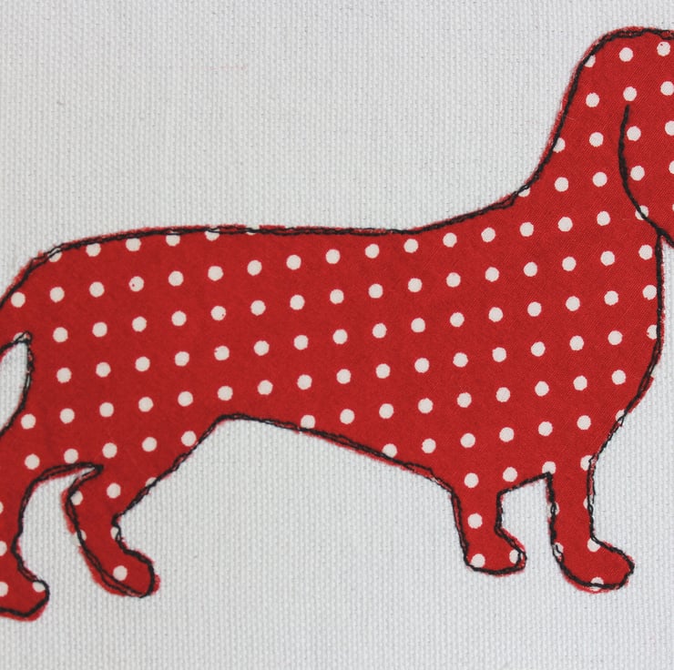 This cute sausage dog shape was hand cut from a lovely, contemporary, bright red, spotty fabric then free machine stitched onto an ivory coloured, heavy weight cotton.