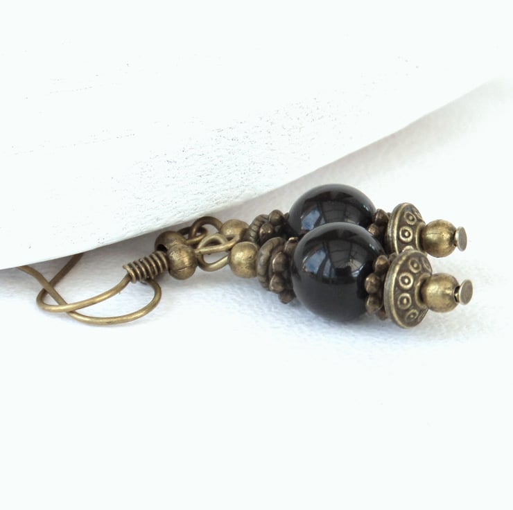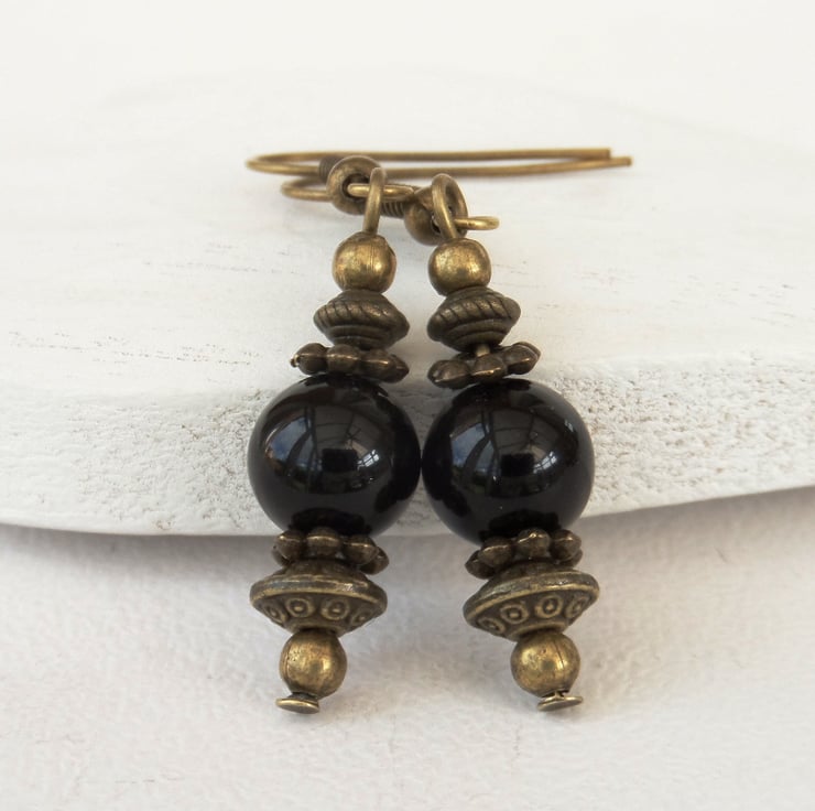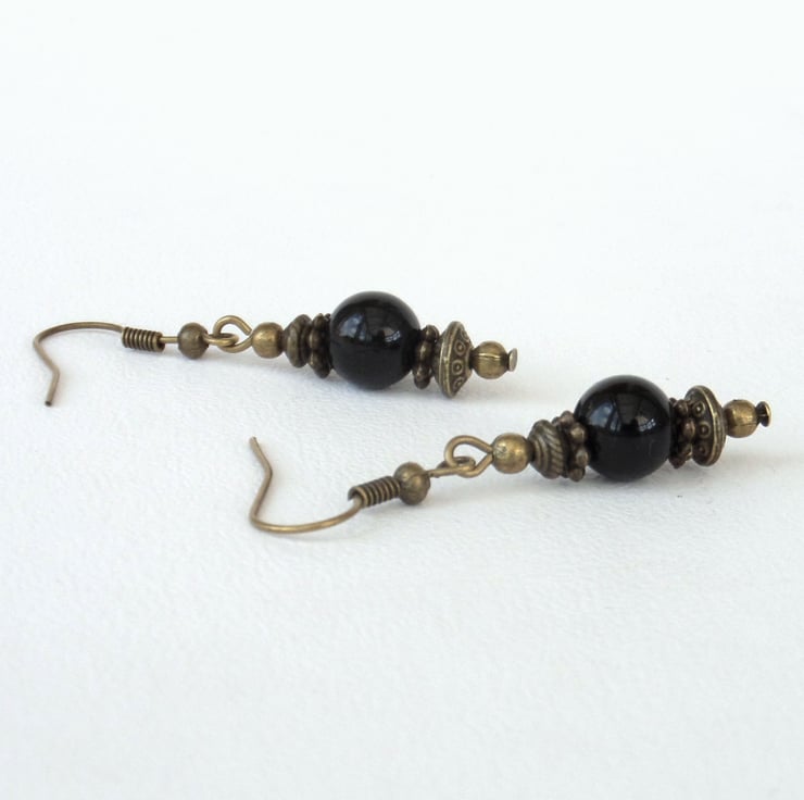 Black onyx beads hang with a mix of bronze beads from bronze earwires in these dangly, yet elegant, earrings.