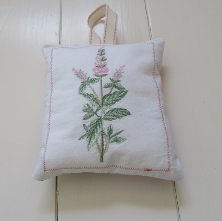 This style uses embroidered pink foxgloves and is backed with handmade patchwork in coordinating colours.