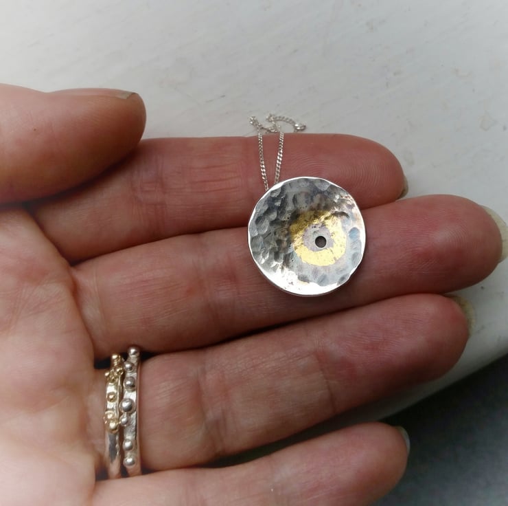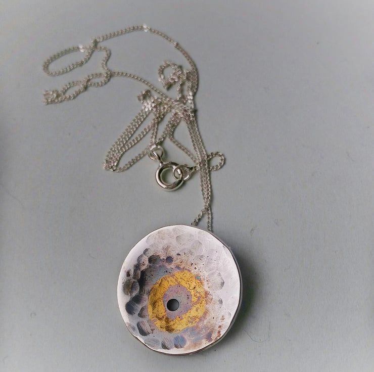 The disc has a little hole and a hammered texture which has been given a highlight of 24 ct gold, then finished with a brown/black patina.