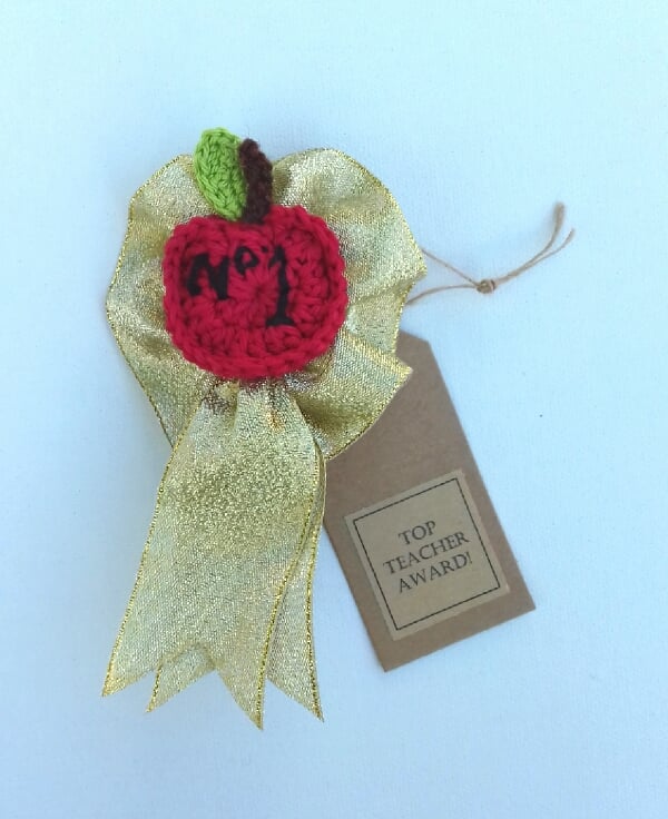 This special award would make a great alternative to a traditional 'Thank You for Teaching Me' card and is a great way to show your appreciation! The apple is crocheted and embrordered in cotton and has been firmly stitched to a rosette made from gold metallic ribbon. Thesee have then been sewn to two layers of felt and a brooch pin. The apple measures approximately 4 cm in diameter and the whole rosette is about 13 cm long. The tag reads 'Top Teacher Award' on one side and is blank on the other for your own message. It comes wrapped in tissue in a labelled box all ready to be given in style!