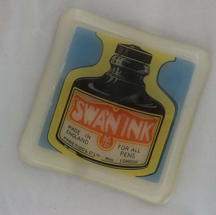 This coaster has a vintage ink bottle design on cream marbled glass. The design is made from a commercially available ceramic decal. It has been fully annealed to make it strong and is suitable for use with hot tea or coffee cups but not pans straight from the oven. It would make a great gift, secret santa or stocking filler.