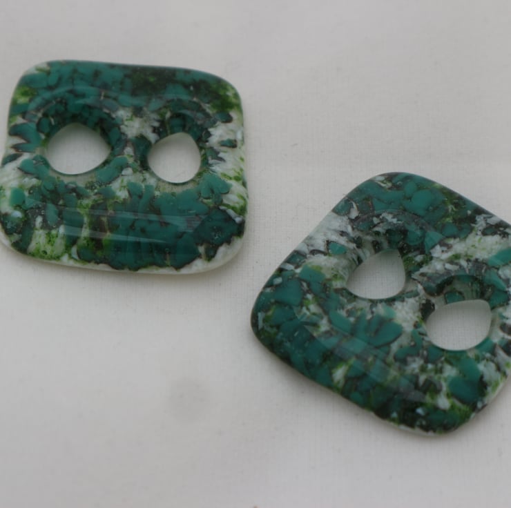 Each button is handmade and there will be some irregularities in shape due to this - do not expect perfectly matched holes! Frit casting is done by combining tiny pieces of glass, including clear, within a casting mould. This means that there may be variations of colour depth within the piece and this is normal.