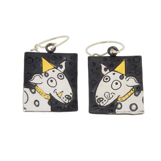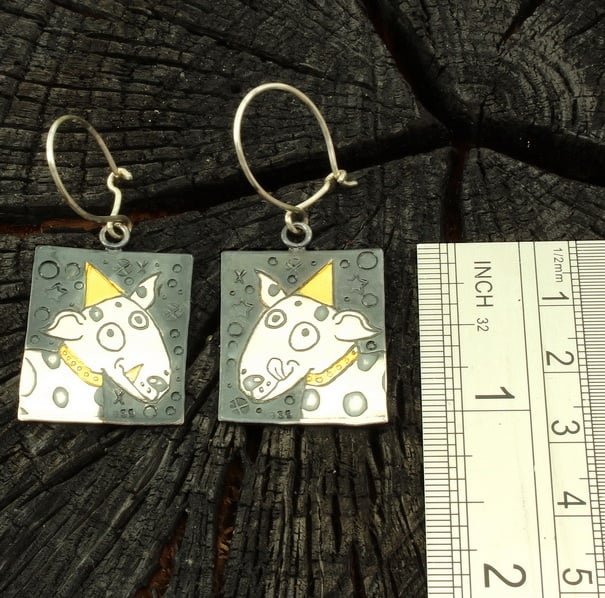 These dog earrings are made from sterling silver and 24 carat gold and they measure 20mm x 25mm and have a total drop length of 48mm. The technique used is an ancient one called Keum boo, where gold is fused to silver at a high temperature. These earrings hang on sterling silver ear wires, which are also made by us, we also make a matching dog brooch.