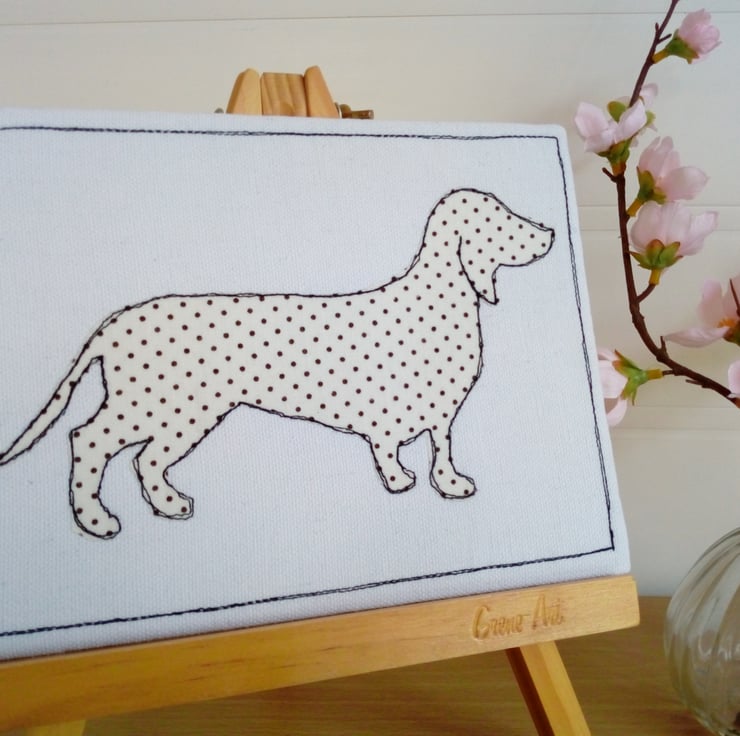 This cute dachshund dog shape was hand cut from a contemporary black and neutral spotty fabric then free motion machine stitched onto an ivory coloured heavy weight cotton. A black machine stitched border surrounds the dog to frame it.