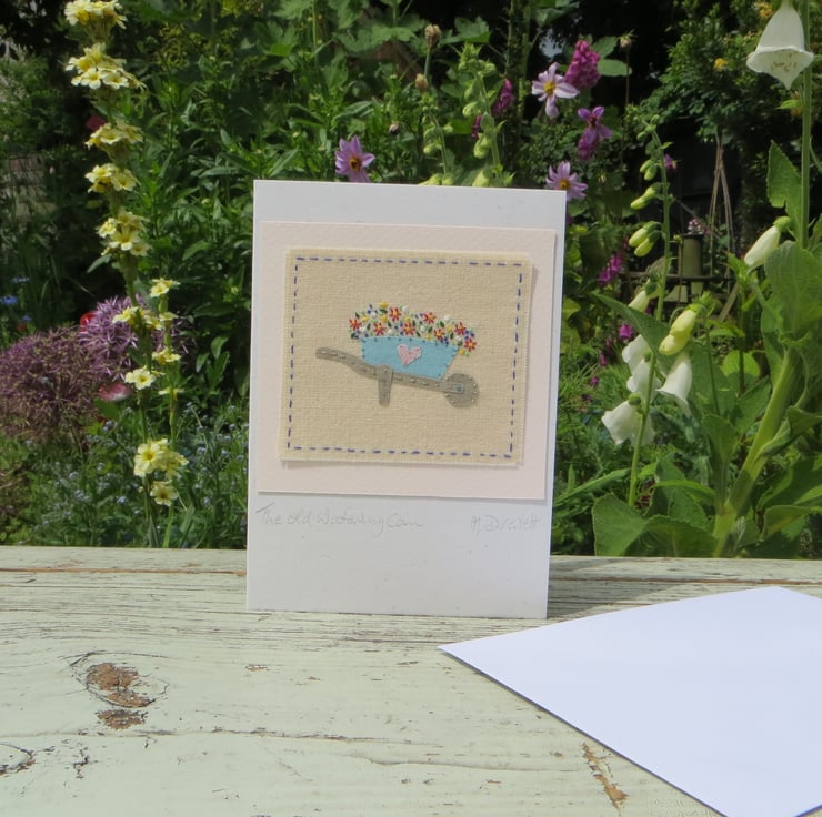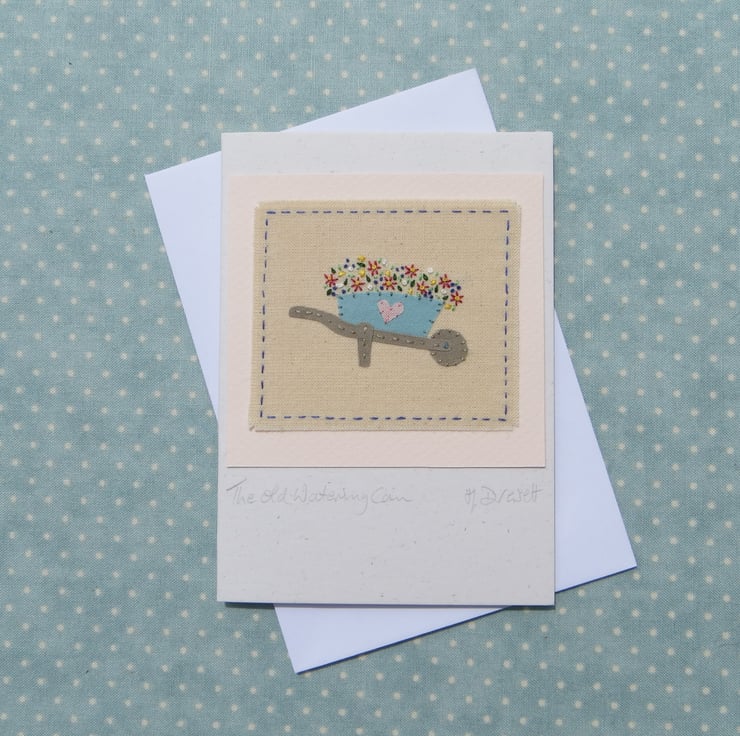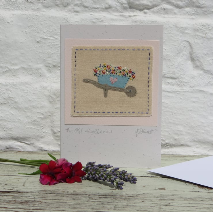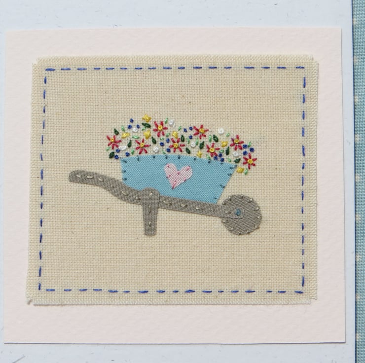 This design was based on a very old wooden wheelbarrow that we inherited. It was this lovely colour and I decided to make it into one of my stitched card designs, filling it with embroidered flowers. Sadly the old barrow is no longer still standing, but this is a way to remember it and all the miles it would have traveled!