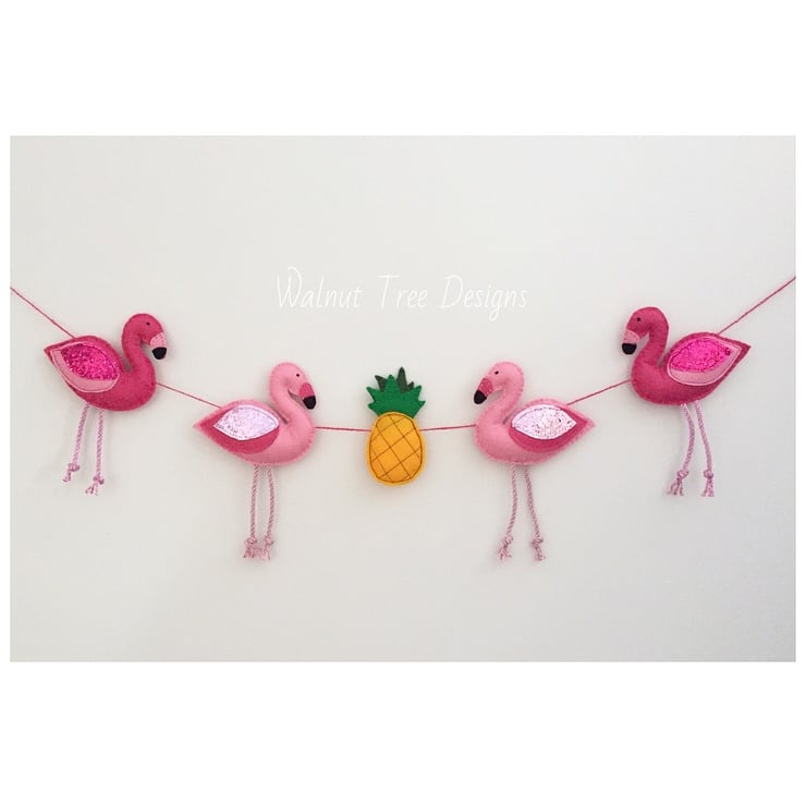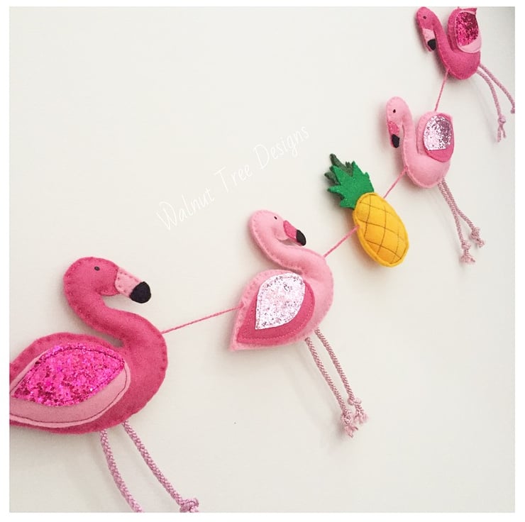 Handsewn felt flamingos and pineapple, formed into a decorative garland. Ideal for a nursery, bedroom...or really wherever you fancy!