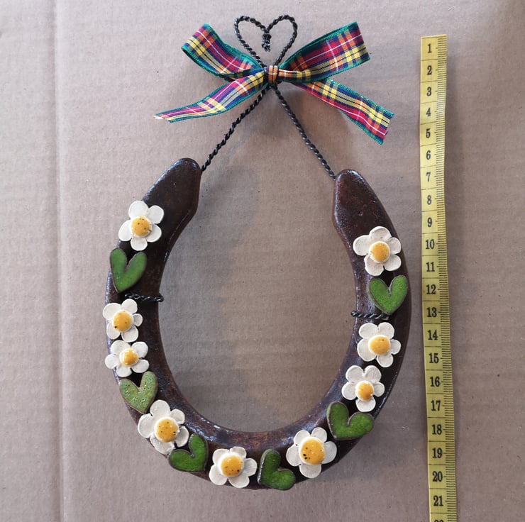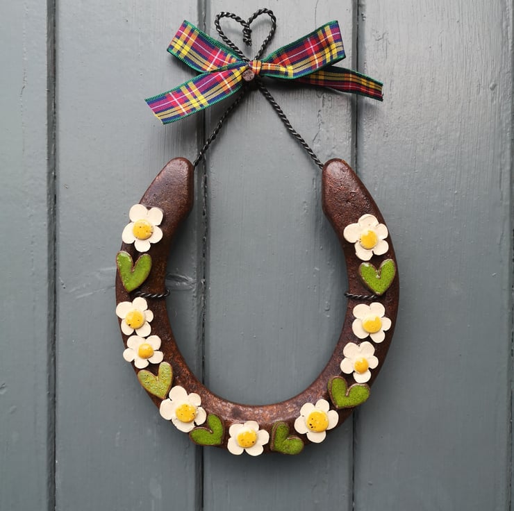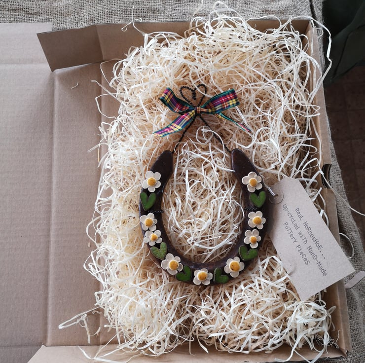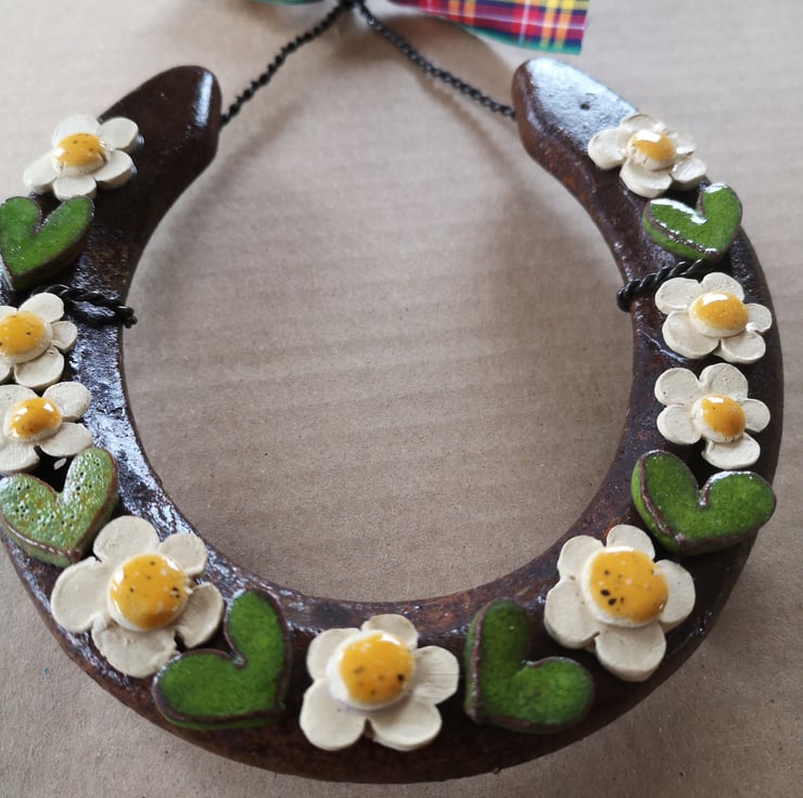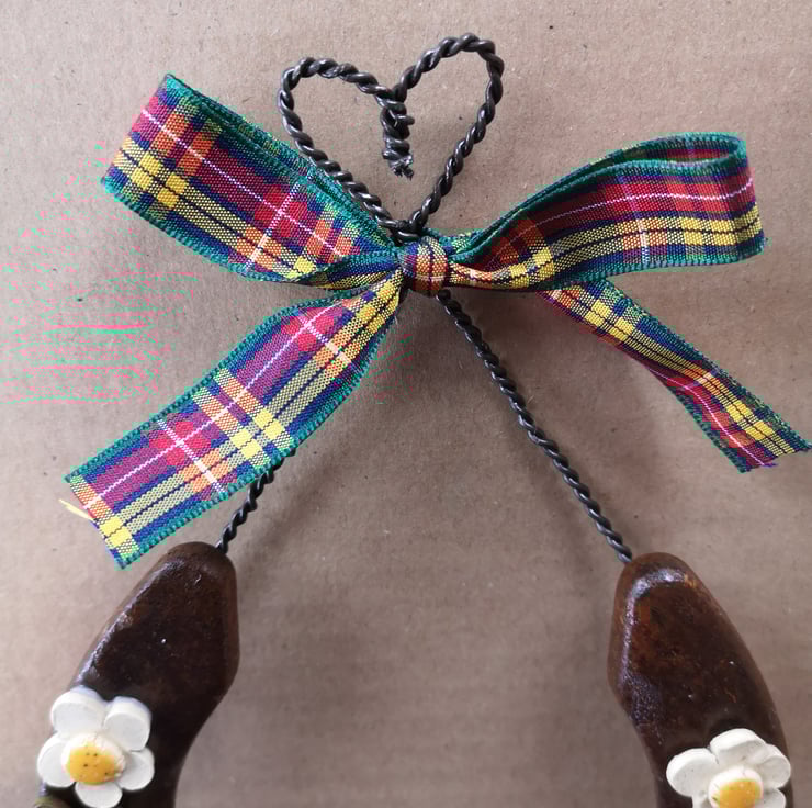 Every shoe is lovingly recycled into an individual,rustic wedding or housewarming gift using handmade pottery hearts and flowers.
