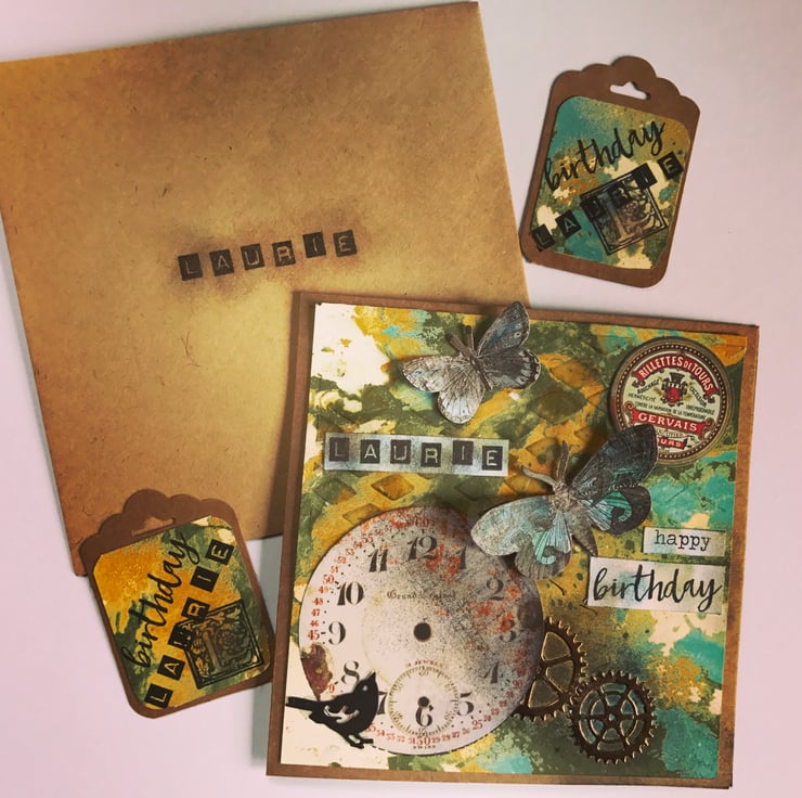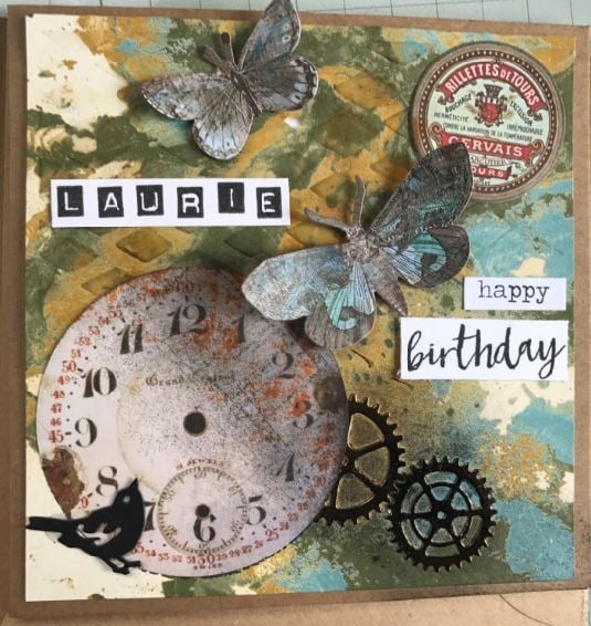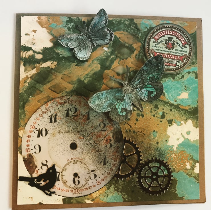 A striking birthday card handmade, this is a Steampunk inspired by love of clocks and butterflies. Textured paste was stencilled onto the designer paper. Tim Holtz's Ephemera images were used to add texture and layers to this card. Die-cut cogs in copper then aged.