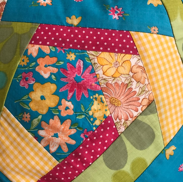 This cushion cover is made from lots of scraps of pretty floral, spotted and gingham fabrics in beautiful sunny colours, combined in a crazy patchwork. The result is a unique and eye catching cushion.
