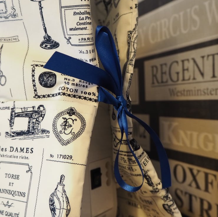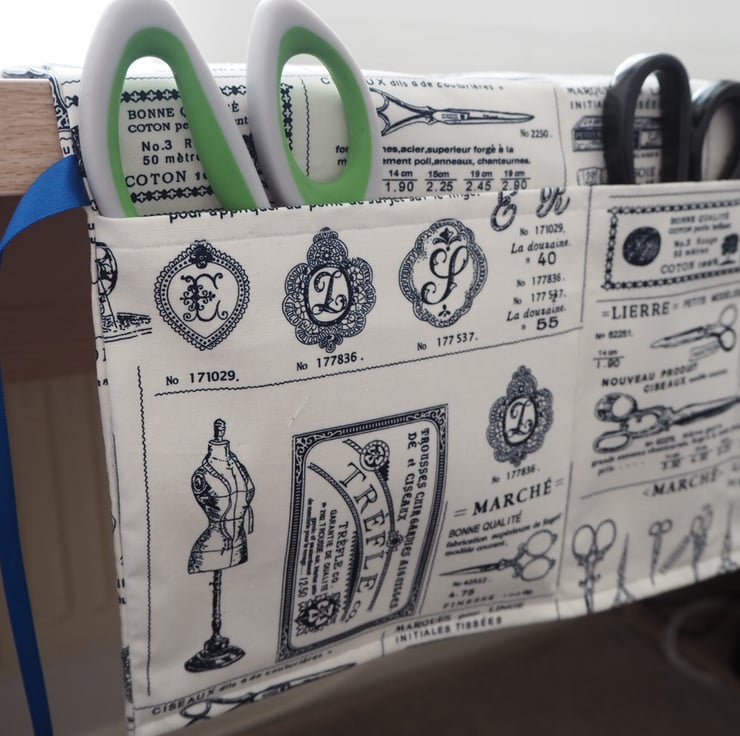 A protective cover for your machine when not in use, with ties made from beautiful blue ribbon at the sides to keep the cover secure, and pockets of various sizes to store your machine and sewing accessories.