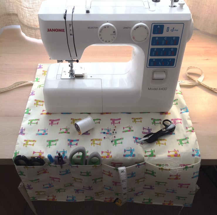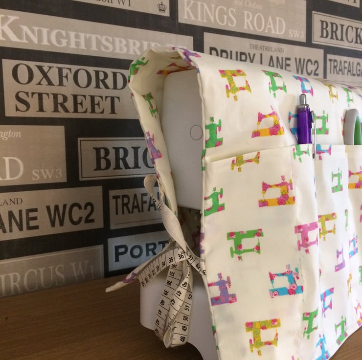 A protective cover for your machine when not in use, with ties made from beautiful measuring tape ribbon at the sides to keep the cover secure, and pockets of various sizes to store your machine and sewing accessories.