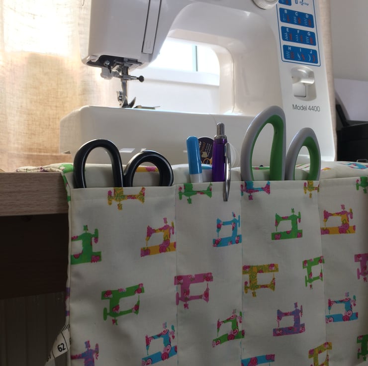 This is also a mat for your sewing machine to be stood on when in use. The storage pockets can now be used to keep your accessories handy and the larger pocket at the end can also be used as a thread catcher bin.