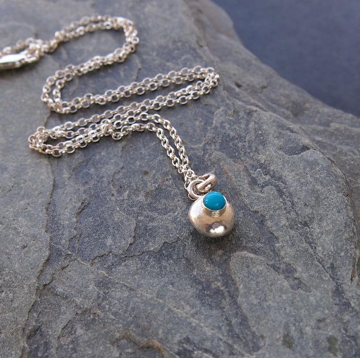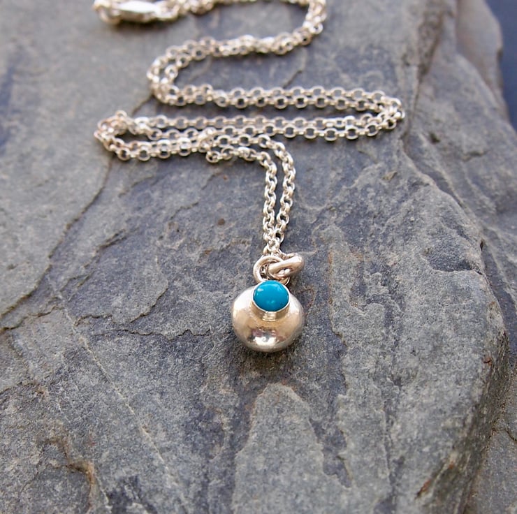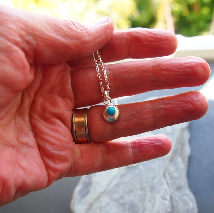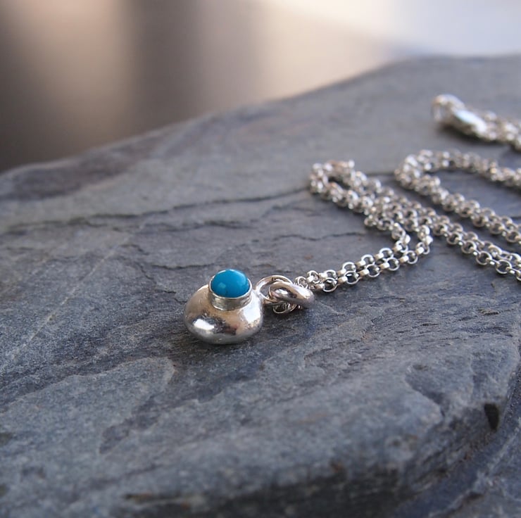This is the prettiest little necklace - a silver hand made pebble has a little turquoise stone mounted on it which is held by a fine sterling silver chain.