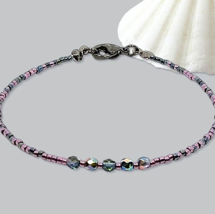For this dainty bottle green & purple handmade boho layering bracelet I chose high quality Miyuki Delica seed beads.