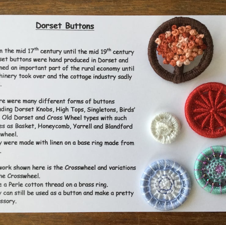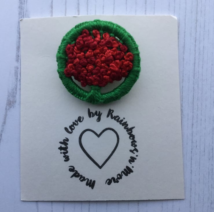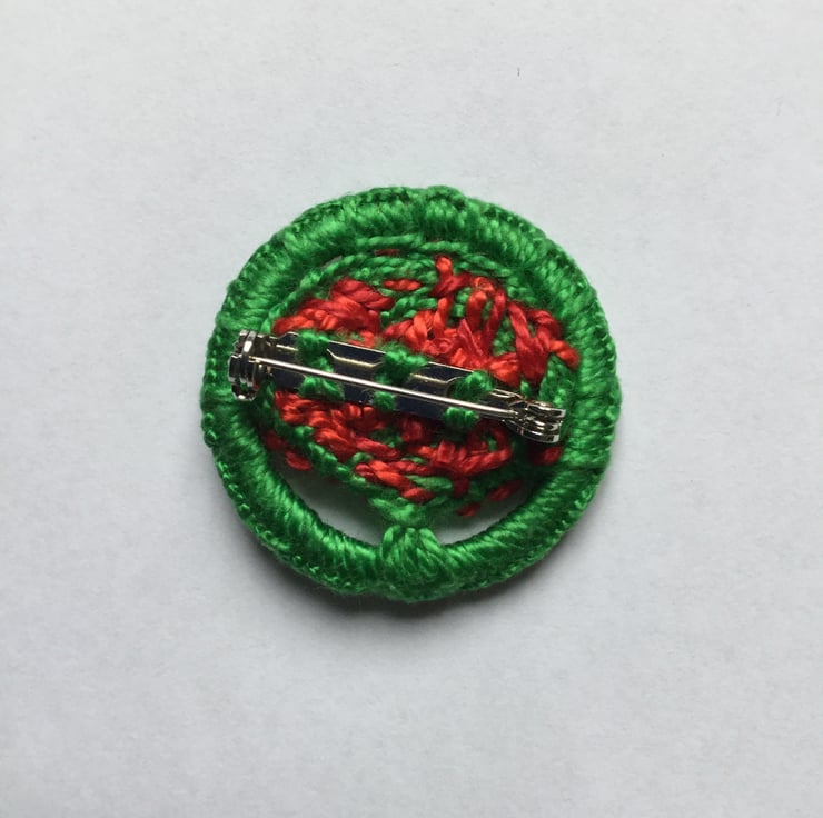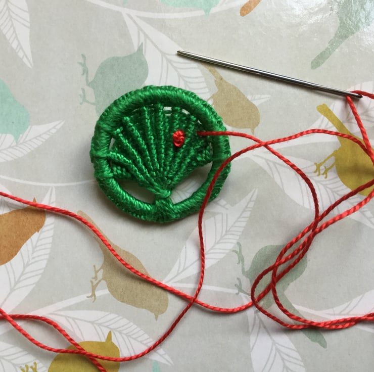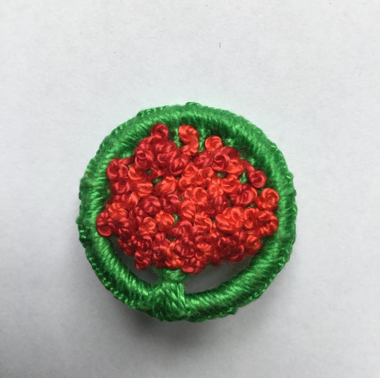 I have made this Dorset Button brooch using green cotton thread on a 32mm brass ring. I have then embroidered French knot 'apples' in two shades of red.