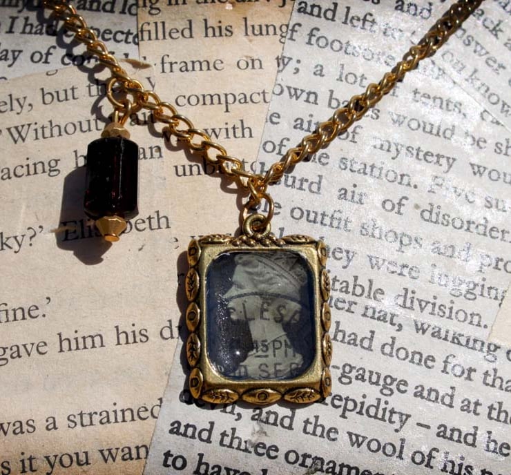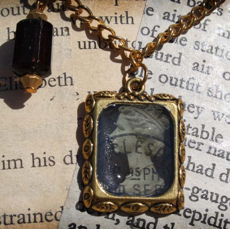 A 1989 black postage stamp which features the sorting office stamp has been set into a gold tone frame and sealed with dimensional mod podge. It hangs on a gold tone chain, accented with a black faceted bead.