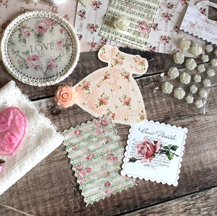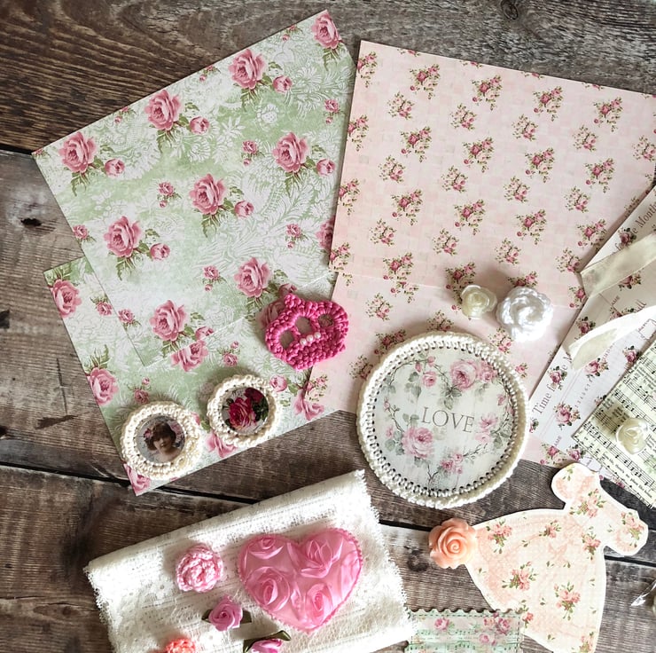 Beautiful shabby chic inspiration kit full of lovely hand crocheted items , papers and lots of other goodies.