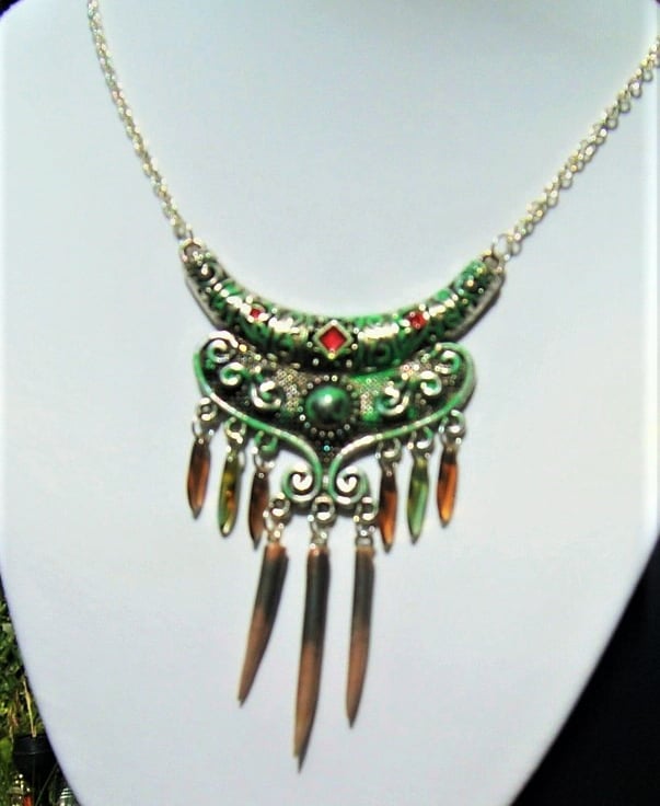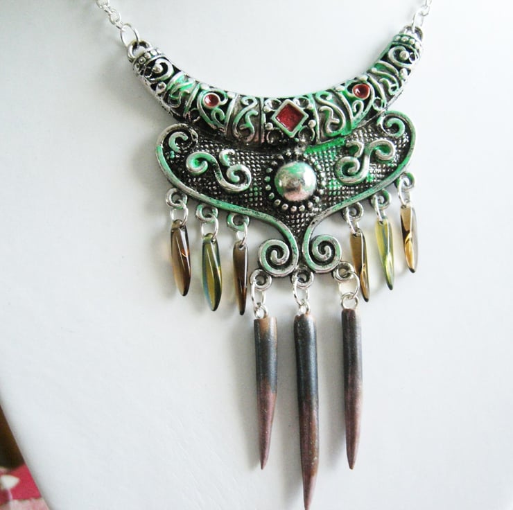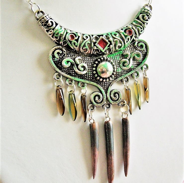 Lovely OOAK necklace made using glass dagger beads and polymer clay daggers ... several techniques used including the application of vintaj patina and pebeo paints ... very unusual design I only made one of these and comes complete with a silver plated chain ..