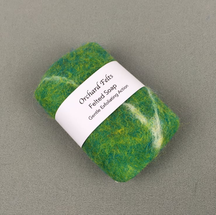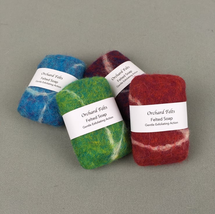 Woollen fibres have been wrapped around a soap bar and felted to create a woollen blanket round the soap. To use, just wet and gently massage until the soapy lather comes up through the felt then use as regular soap. As the soap is used up you will eventually be left with a little woollen pouch which can be cut open and a new soap inserted if desired. Alternatively it can just be used as an exfoliating cloth on its own.