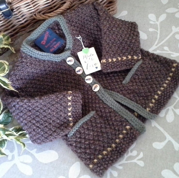 A wonderful practical textued designer baby boys aran jacket made in Cornwall. It will be ideal for wearing whilst out and about in the buggy/car when an outer thick coat/all in one suite is not required. I have designed the garment to incorporate two little pockets with genuine wooden button with a hippo design on them.