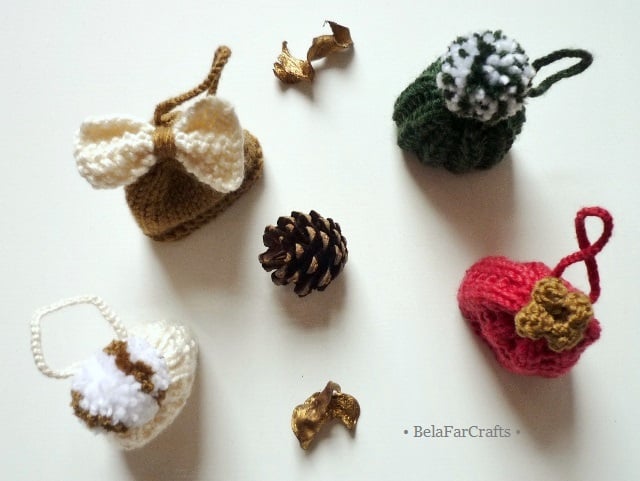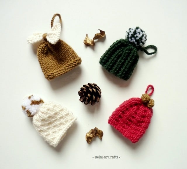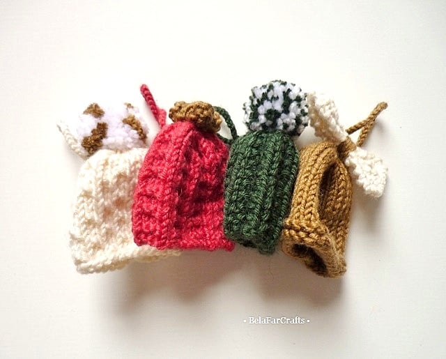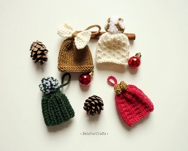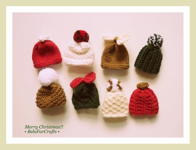 I designed and hand knit these mini hats using mostly natural yarns in traditional Xmassy colours. They measure about 5 - 7cm (2-3in) tall / wide, including the embellishments.