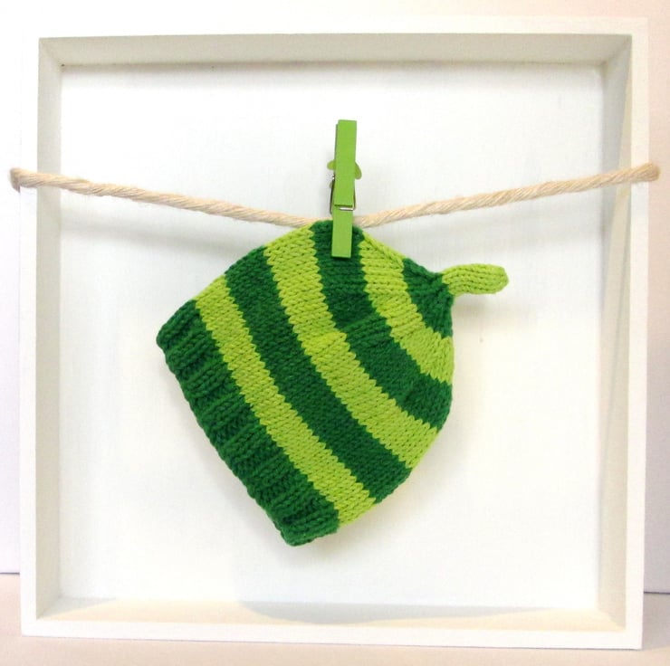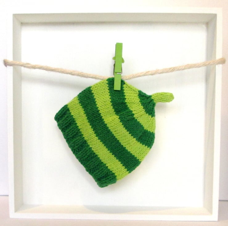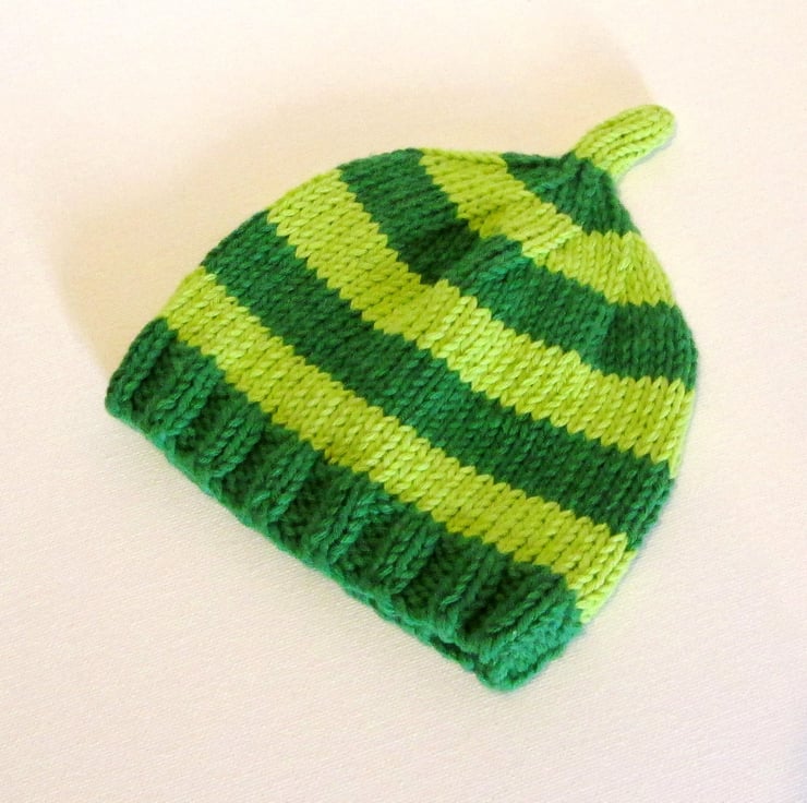 This stripy Dark Green and Lime Green baby beanie hat is hand knitted in a soft 100 per cent pure cotton, it has a decorative stalk on the top and a ribbed brim and is for an age 0 to 2 month baby.