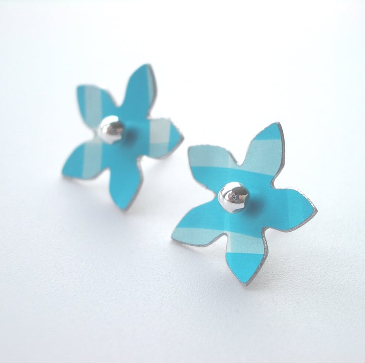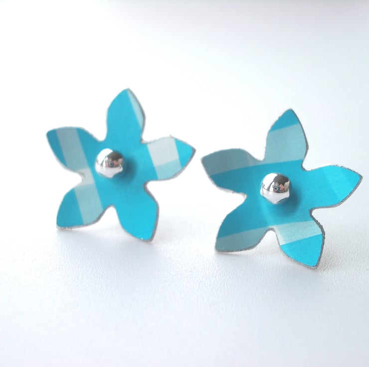 These sweet little flower earrings are made from aluminium which I have dyed with turquoise checks and sealed so that the colour becomes a permanent part of the metal. I then saw pierce the flower shapes by hand, file and emery the edges to give a smooth finish and dome them inwards so that they curve like a real flower.