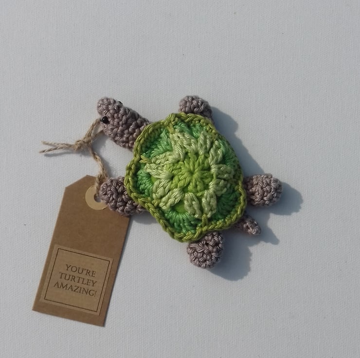 This cheerful little fellow would make a great alternative to a greetings card and is perfect for telling someone how special they are! It is crocheted in cotton and has been lined with felt to prevent the stuffing showing through . The head and body are filled with polyester wadding and its eyes are tiny black beads. It is carrying a tag in its mouth which reads'You are turtley amazing!' Please note that I am very happy to exchange this for one with a message of your choice. It comes in a labelled PIP (Postage in Proportion )box all ready to be given or posted in style.