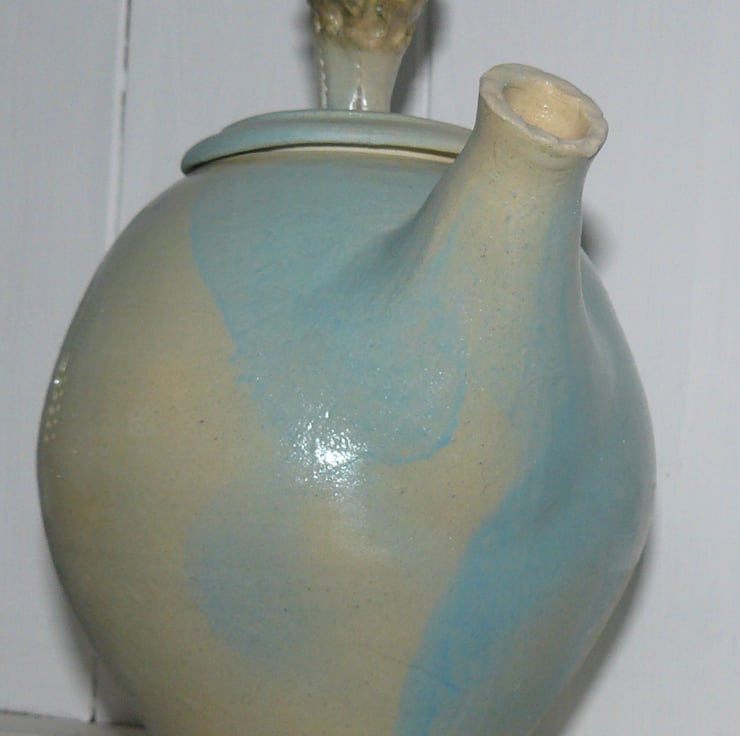 Thrown on the wheel & altered. Sprayed with turquoise slip & then fired to stoneware temperature, so suitable to hold water. 21 x 19cms.