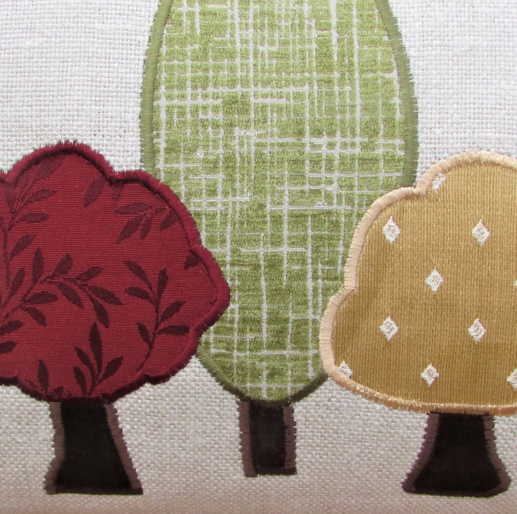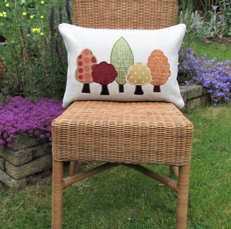 An Autumn trees rectangular cushion made from a rustic woven cream fabric with a woodland applique design of five trees in Autumn colours. The trees consist of a variety of fabrics with wonderful woven or textured patterns in warm Autumnal shades of terracotta, red, gold, orange and green. The trunks are made from a lovely rich brown velvet-finish fabric.
