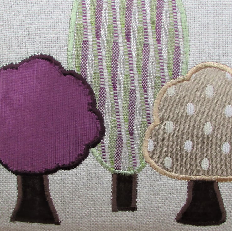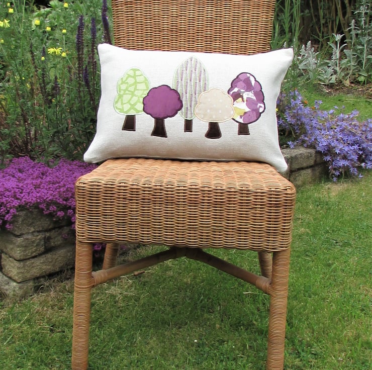 A Spring trees rectangular cushion made from a rustic woven cream fabric with a woodland applique design of five trees in Spring colours. The trees consist of a variety of fabrics with wonderful woven, print and textured patterns in fresh Spring shades of green, purple and gold. The trunks are made from a lovely rich brown velvet-finish fabric.
