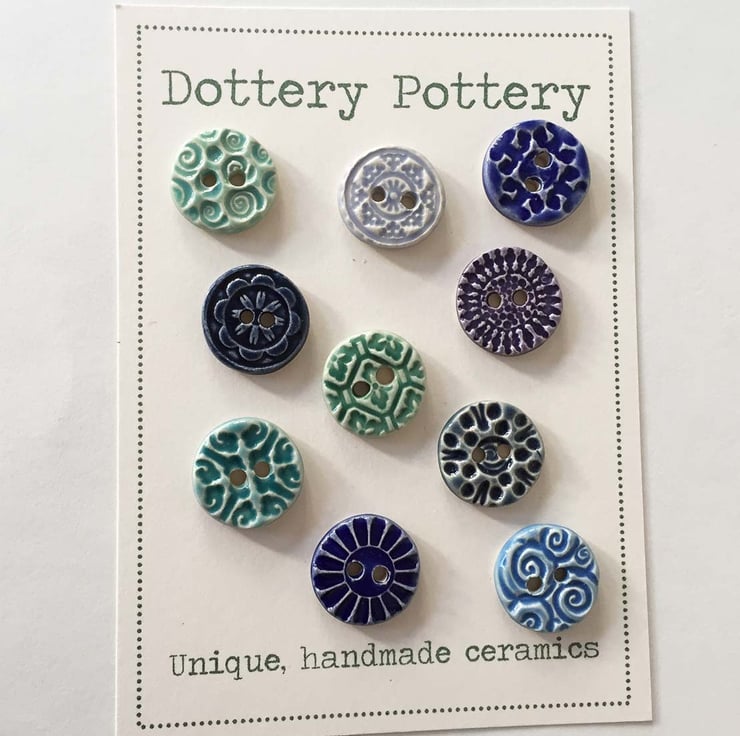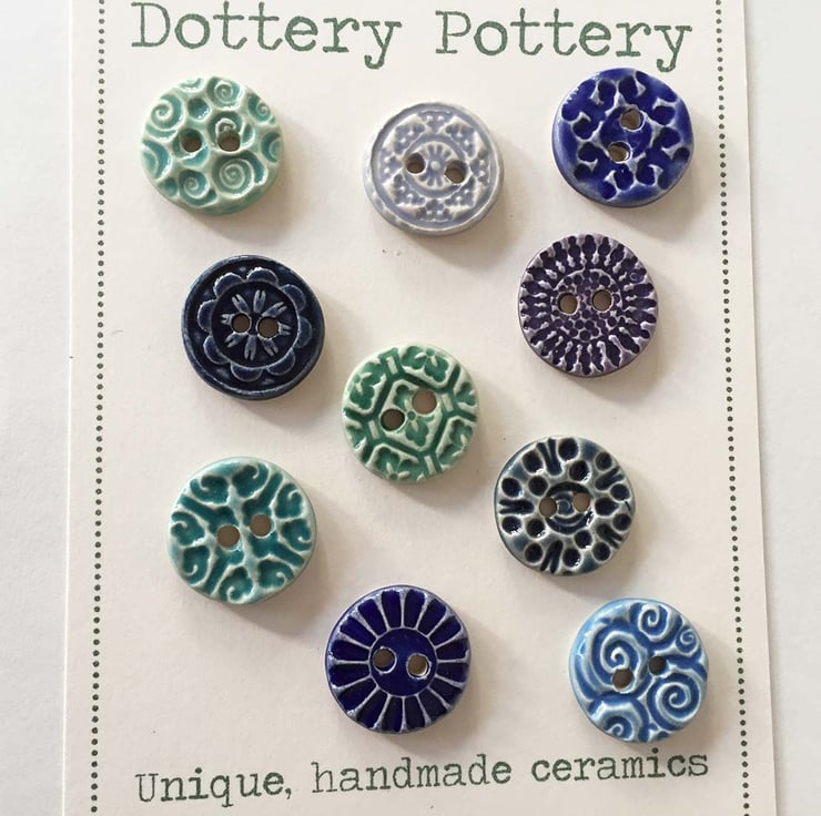 This cute little set of buttons are made from white earthenware clay and twice fired to a top temperature of 1100 degrees, so they are nice and strong.