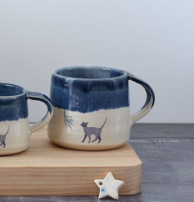 The 'cat with attitude' image on this lovely blue and white mug was created by Zanna - you'll also find it on our matching espresso cup. It's fused right into the clay and will not fade over time.